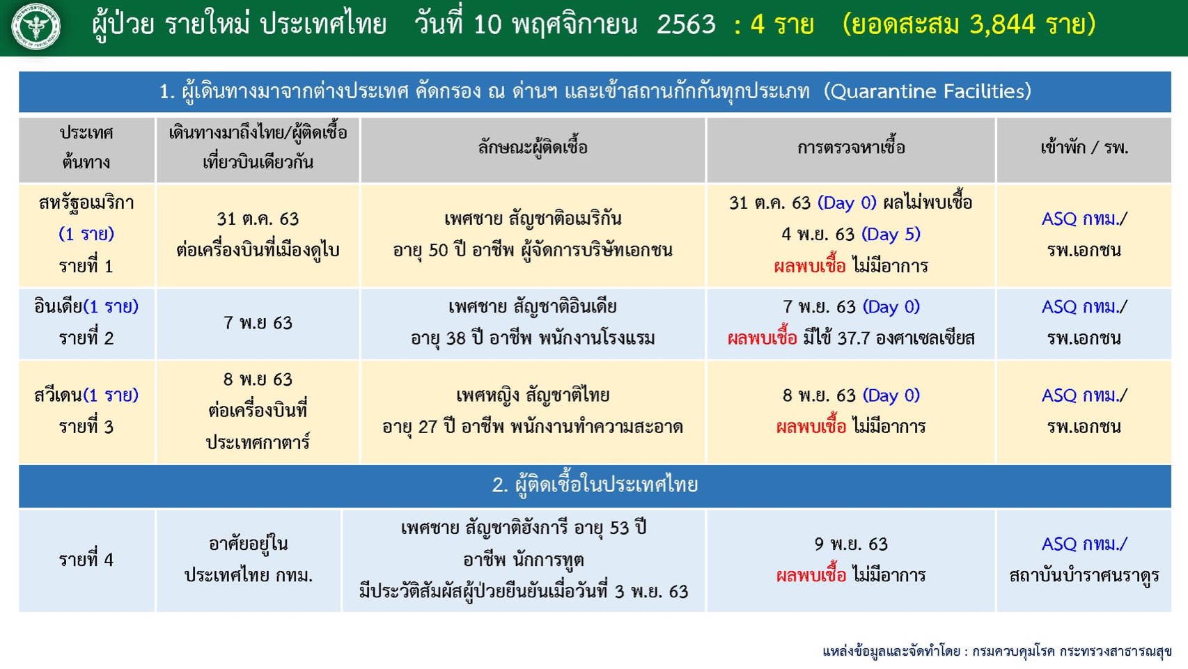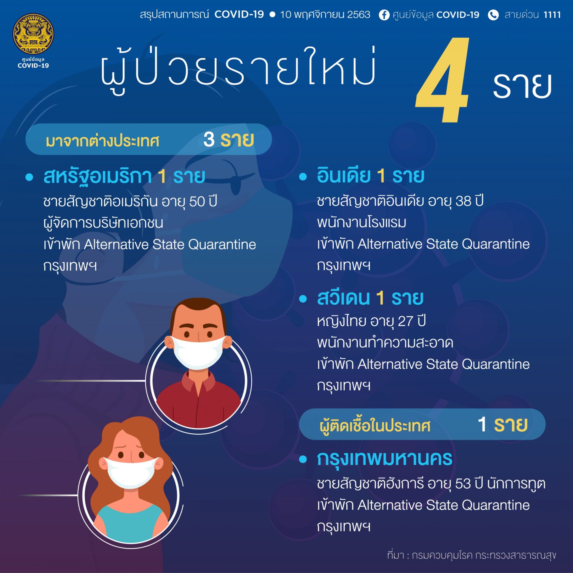ผู้ป่วยรายใหม่ 4ราย เป็นคนไทย1ราย สัญชาติอเมริกัน1ราย อินเดีย 1ราย ทั้งหมดเดินทางมาจากต่างประเทศ จากสหรัฐอเมริกา1ราย อินเดีย 1ราย สวีเดน 1 ราย เข้าพักสถานที่กักกันที่รัฐจัดให้ (Alternative State Quarantine) และสัญชาติฮังการี1ราย เป็นผู้ติดเชื้อในประเทศไทย อาศัยอยู่ในกรุงเทพมหานคร ประวัติสัมผัสผู้ป่วยยืนยันเมื่อวันที่ 3 พ.ย.63