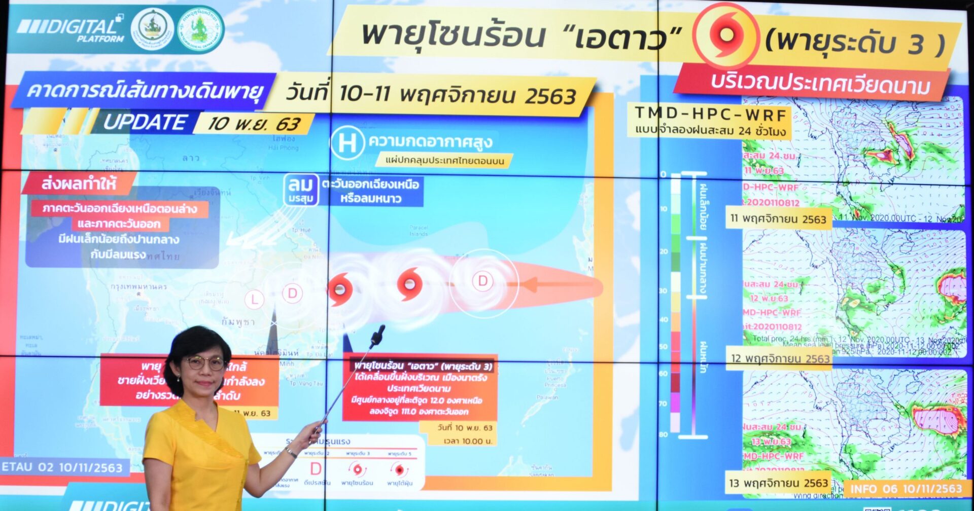 น.ส.กรรวี สิทธิชีวภาค รองอธิบดีกรมอุตุนิยมวิทยา รักษาราชการแทนอธิบดีกรมอุตุนิยมวิทยา กล่าวถึงสถานการณ์พายุโซนร้อน “เอตาว” ว่า เช้านี้ได้เคลื่อนขึ้นฝั่งประเทศเวียดนามแล้ว คาดว่าพายุลูกนี้จะอ่อนกำลังลงเป็นดีเปรสชั่นและสลายตัวเป็นหย่อมความกดอากาศต่ำที่ประเทศกัมพูชา แต่ด้วยอิทธิพลของตัวพายุ ในช่วง 11-12 พ.ย. จะทำให้ประเทศไทยทางภาคตะวันออกเฉียงเหนือ ภาคตะวันออกและภาคกลางบางส่วน ยังคงมีฝนตกเล็กน้อยถึงฝนเบา เนื่องจากช่วงนี้อากาศเย็นปกคลุมอยู่ทางประเทศไทยตอนบน แต่ภาคใต้ยังน่าห่วง ตั้งแต่ จ.ชุมพร ลงไป อาจเจอฝนหนักถึงนักมาก และ จ.พัทลง สุราษฎร์ธานี มีโอกาสน้ำท่วมฉับพลัน น้ำป่าไหลหลากได้ ศูนย์อุตุนิยมวิทยาประจำภาคได้ประสานจังหวัดและหน่วยงานที่เกี่ยวข้องเตรียมรับมือแล้ว