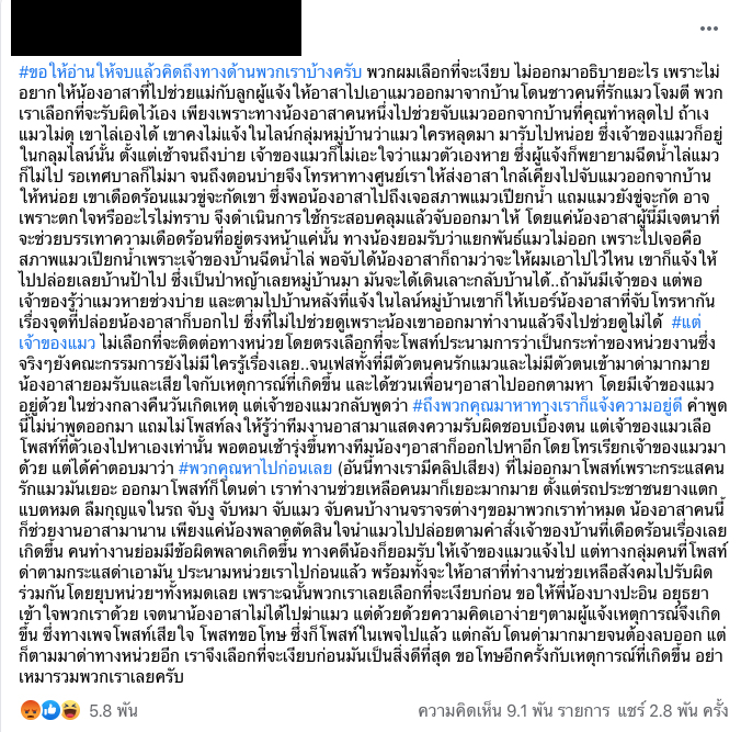 วันนี้ (10 พ.ย.) เพจกู้ภัยได้โพสต์ชี้แจงกรณีดังกล่าว ยอมรับและเสียใจกับเหตุการณ์ที่เกิดขึ้น ยืนยันว่า เจ้าหน้าที่ไม่ได้มีเจตนาฆ่าแมว แค่ทำตามคำสั่งของเจ้าของบ้านที่เดือดร้อนเท่านั้น