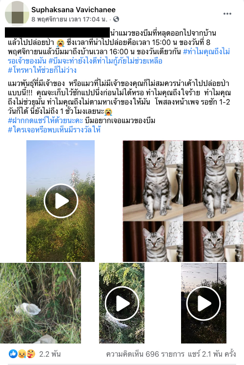 เจ้าของโพสต์ข้อความสุดเศร้าว่า “นำแมวของบีมที่หลุดไปจากบ้านแล้วไปปล่อยป่า” ซึ่งเวลาที่ปล่อยคือ 15.00 น.ของวันที่ 8 พ.ย. บีมมาถึงบ้าน 16.00 น. ของวันเดียวกัน ซึ่งเจ้าตัวชี้แจงว่า เธอไปพักผ่อนที่ จ.สระบุรี ไม่มีสัญญาณอินเทอร์เน็ต จึงไม่เห็นจากกล้องวงจรปิดว่า แมวหลุดออกจากบ้าน