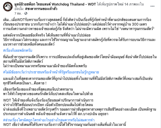 ทางเพจ “มูลนิธิวอชด็อก ไทยแลนด์” ได้โพสต์แสดงความคิดเห็น กรณีเคสนี้ว่า เจ้าหน้าที่กู้ภัยทำหน้าที่ตามปกติตามที่ประชาชนร้องเรียน บวกกับการอ้างว่า ไม่ได้นำแมวไปปล่อยป่า แต่ปล่อยไว้ห่างจากหมู่บ้าน 300 เมตร การแจ้งความกล่าวหาของเจ้าของต่อกู้ภัย จึงคิดว่า ไม่น่าจะมีความผิด เพราะไม่ใช่ “เจตนาทารุณกรรมสัตว์”