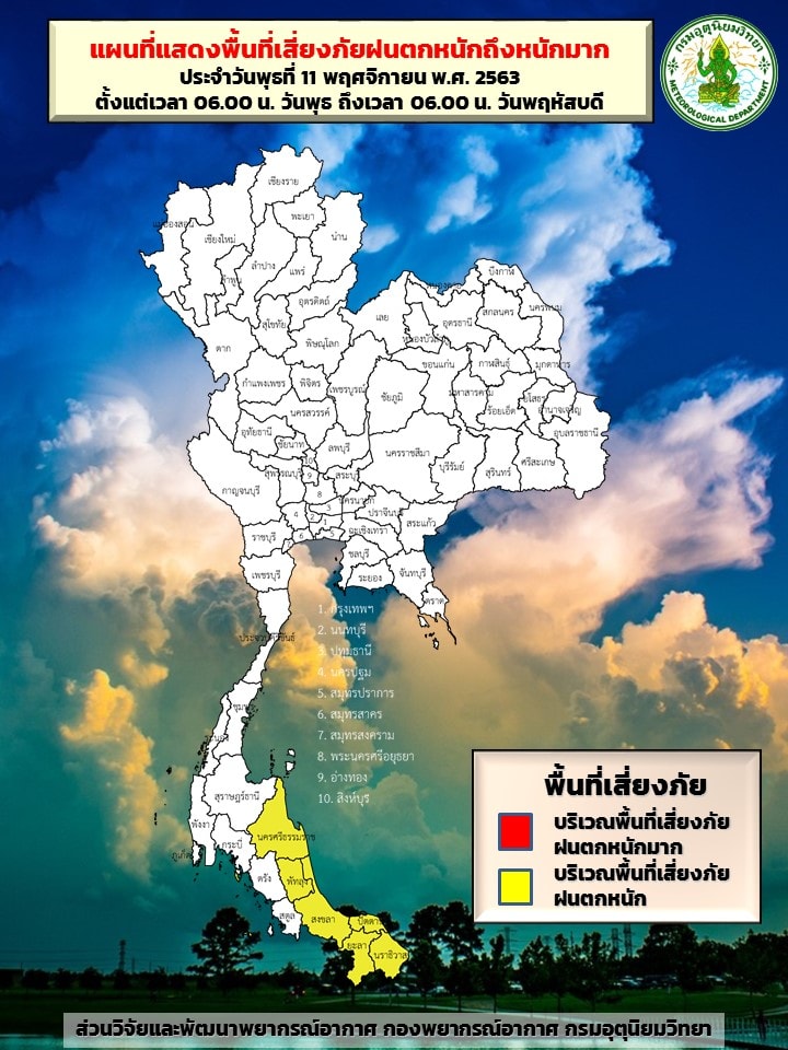 สำหรับมรสุมตะวันออกเฉียงเหนือที่พัดปกคลุมอ่าวไทยและภาคใต้มีกำลังแรง ทำให้ภาคใต้ตอนล่างยังคงมีฝนตกหนักบางแห่ง ขอให้ประชาชนบริเวณภาคใต้ระวังอันตรายจากฝนตกหนักและฝนที่ตกสะสมไว้ด้วย ส่วนคลื่นลมบริเวณอ่าวไทยมีกำลังปานกลาง โดยมีคลื่นสูงประมาณ 2 เมตร บริเวณที่มีฝนฟ้าคะนอง คลื่นสูงมากกว่า 2 เมตร ขอให้ชาวเรือบริเวณดังกล่าวเดินเรือด้วยความระมัดระวัง