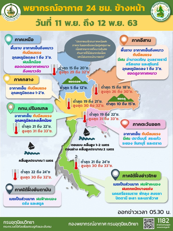 กรมอุตุฯ 11 พ.ย. – กรมอุตุฯ เผยไทยตอนบนอากาศเย็นถึงหนาว กับมีลมแรง อุณหภูมิลดลงอีก 1-3 องศาฯ ยอดดอย-ยอดภู อากาศหนาว ส่วนกรุงเทพฯ-ปริมณฑล อากาศเย็น อุณหภูมิลดลงเล็กน้อย