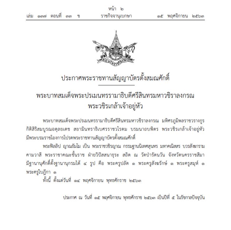 วันเดียวกันนี้ ราชกิจจานุเบกษายังประกาศพระบรมราชโองการ ประกาศพระราชทานสัญญาบัตรตั้งสมณศักดิ์ “พระฟิลลิป ญาณธัมโม” เป็นพระราชวชิรญาณ กรรมฐานนิเทศสุนทร มหาคณิสสร บวรสังฆารามคามวาสี พระราชาคณะชั้นราช ฝ่ายวิปัสสนาธุระ สถิต ณ วัดป่ารัตนวัน จังหวัดนครราชสีมา.-สำนักข่าวไทย