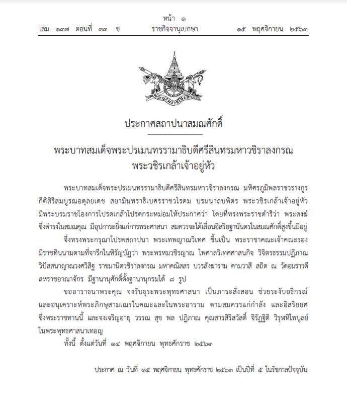 วันนี้ (15 พ.ย.) ราชกิจจานุเบกษาประกาศพระบรมราชโองการ ประกาศสถาปนาสมณศักดิ์ “พระเทพญาณวิเทศ” ขึ้นเป็นพระราชาคณะเจ้าคณะรอง มีราชทินนามตามที่จารึกในหิรัญบัฏว่า พระพรหมวชิรญาณ ไพศาลวิเทศศาสนกิจ วิจิตรธรรมปฏิภาณวิปัสสนาญาณวงศวิสิฐ ราชมานิตวชิราลงกรณ มหาคณิสสร บวรสังฆาราม คามวาสี สถิต ณ วัดอมราวดีสหราชอาณาจักร
