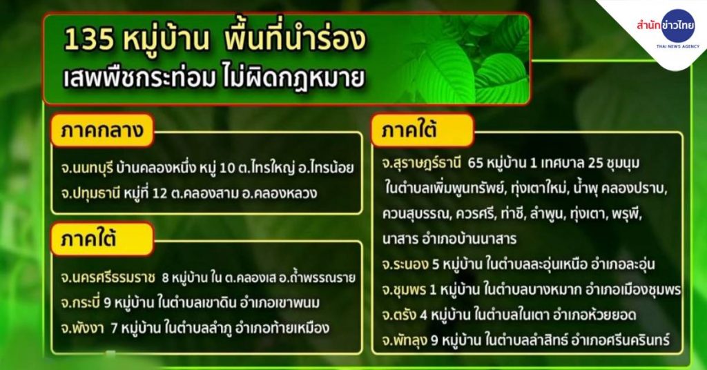 กรุงเทพฯ 16 พ.ย.- คณะกรรมการป้องกันและปราบปรามยาเสพติด (ป.ป.ส.) เห็นชอบพื้นที่นำร่อง 10 จังหวัดภาคกลางและใต้ รวม 135 หมู่บ้าน ให้เสพพืชกระท่อมได้โดยไม่ผิดกฎหมาย มีเงื่อนไขต้องลงทะเบียนก่อน