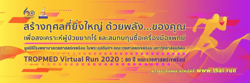 คณะเวชศาสตร์เขตร้อน มหาวิทยาลัยมหิดล และมูลนิธิโรงพยาบาลเวชศาสตร์เขตร้อน ในพระอุปถัมภ์สมเด็จพระเจ้าพี่นางเธอ เจ้าฟ้ากัลยาณิวัฒนา กรมหลวงนราธิวาสราชนครินทร์ ขอเชิญชวนผู้ที่สนใจและรักในสุขภาพ ร่วมกิจกรรมวิ่งการกุศล “TROPMED Virtual Run 2020 : 60 วัน 60 กิโลเมตร เพื่อ 60 ปี คณะเวชศาสตร์เขตร้อน” เนื่องในโอกาส 60 ปี แห่งการก่อตั้งคณะเวชศาสตร์เขตร้อน และ 25 ปี การจัดตั้งมูลนิธิโรงพยาบาลเวชศาสตร์เขตร้อน ในพระอุปถัมภ์ฯ รายได้หลังหักค่าใช้จ่ายจะสมทบทุนให้แก่มูลนิธิโรงพยาบาลเวชศาสตร์เขตร้อน ในพระอุปถัมภ์ฯ เพื่อสงเคราะห์ผู้ป่วยยากไร้ และจัดซื้อเครื่องมือทางการแพทย์ของโรงพยาบาลเวชศาสตร์เขตร้อน