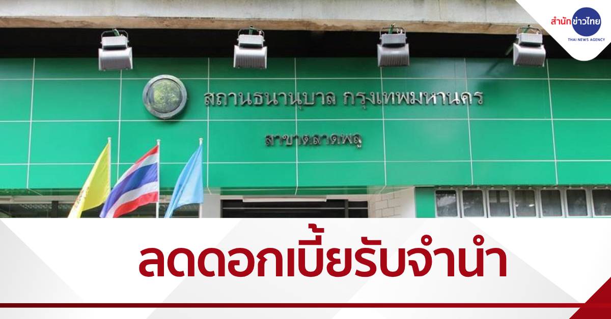 กรุงเทพฯ 18 พ.ย.- กทม.ปรับลดอัตราดอกเบี้ยรับจำนำสำหรับประชาชน ตั้งแต่วันที่ 16 พ.ย.63-30 ก.ย.64 เพื่อช่วยแบ่งเบาภาระค่าครองชีพประชาชน โดยเฉพาะในช่วงวันหยุดและเทศกาลปีใหม่