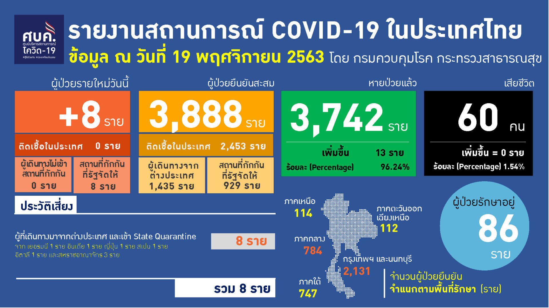 “ศูนย์ข้อมูล COVID-19” รายงาน “ยอดผู้ติดเชื้อโควิด-19” วันนี้ (19 พ.ย.) ไทยพบผู้ติดเชื้อรายใหม่เพิ่ม 8 ราย ยอดผู้ป่วยสะสม 3,888 ราย ไม่พบผู้เสียชีวิตเพิ่ม รวมยอดผู้เสียชีวิตอยู่ที่ 60 ราย ผู้ป่วยที่รักษาหายแล้ว 3,742 ราย