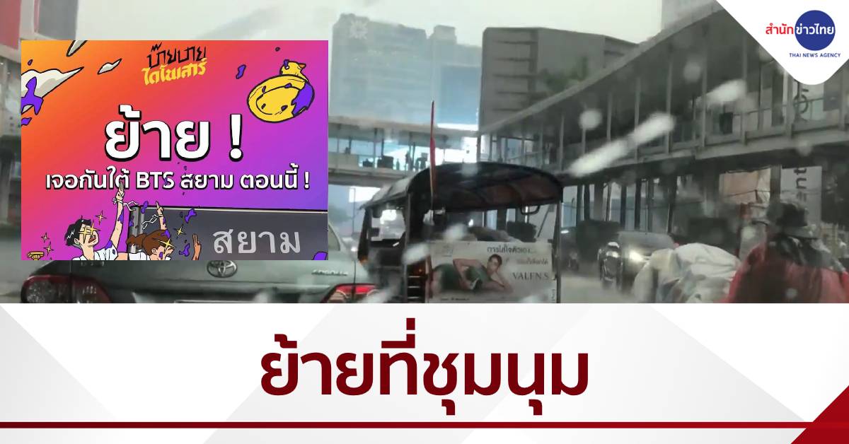 กรุงเทพฯ 21 พ.ย.-ฝนตกหนักที่แยกราชประสงค์ มีน้ำท่วมพื้นผิวถนนเล็กน้อย ทำให้กลุ่มนักเรียนเลว เปลี่ยนสถานที่ชุมนุมเป็นบีทีเอสสยามแทน