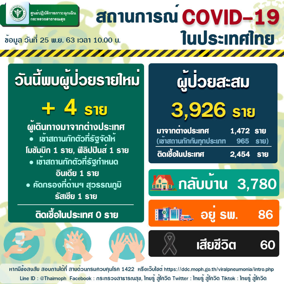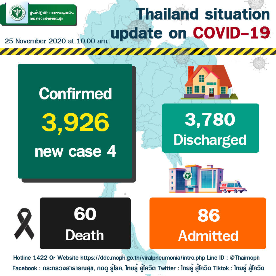 กระทรวงสาธารณสุข รายงานข่าวกรณีโรคติดเชื้อไวรัสโคโรนา 2019 (COVID-19) ประจำวันที่ 25 พฤศจิกายน 2563 ว่า สถานการณ์ผู้ติดเชื้อไวรัสโคโรนา 2019 ในประเทศไทยวันนี้ มีผู้ติดเชื้อรายใหม่ 4 ราย ทุกรายเป็นผู้เดินทางจากต่างประเทศ ตรวจพบที่ด่านควบคุมโรคเข้าเกณฑ์เฝ้าระวังอาการ 1 ราย เข้ากักตัวในสถานที่รัฐจัดให้ 2 ราย และเข้ากักตัวในสถานที่รัฐกำหนด 1 ราย มีผู้ป่วยกลับบ้านได้ 8 ราย ทำให้ผู้ป่วยกลับบ้านสะสม 3,780 ราย หรือคิดเป็นร้อยละ 96.28 ของผู้ป่วยทั้งหมด มีผู้ป่วยยังรักษาอยู่ในโรงพยาบาล 86รายหรือคิดเป็นร้อยละ 2.19 ของผู้ป่วยทั้งหมด ไม่มีผู้เสียชีวิตเพิ่ม รวมผู้เสียชีวิตสะสม 60 ราย ผู้ป่วยสะสมทั้งสิ้น 3,926 ราย