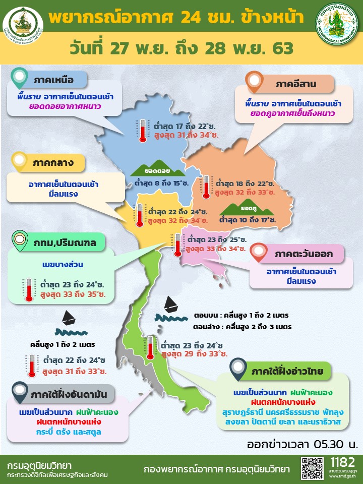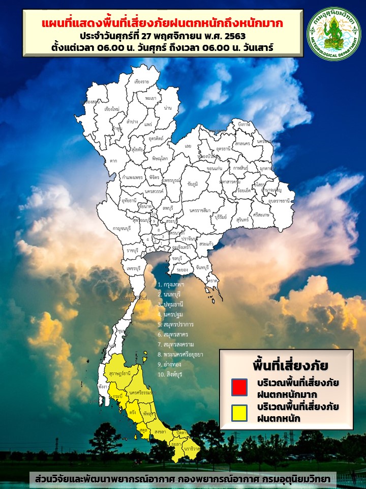 ขณะที่มรสุมตะวันออกเฉียงเหนือที่พัดปกคลุมอ่าวไทยและภาคใต้มีกำลังแรง ประกอบกับมีหย่อมความกดอากาศต่ำปกคลุมบริเวณปลายแหลมมลายู ลักษณะเช่นนี้ทำให้ภาคใต้ตอนล่างมีฝนตกหนักถึงหนักมากบางแห่ง ขอให้ประชาชนบริเวณภาคใต้ตอนล่างระวังอันตรายจากฝนตกหนัก ซึ่งอาจทำให้เกิดน้ำท่วมฉับพลันและน้ำป่าไหลหลากได้ ส่วนคลื่นลมบริเวณอ่าวไทยมีกำลังแรง โดยอ่าวไทยตอนล่างมีคลื่นสูง 2-3 เมตร บริเวณที่มีฝนฟ้าคะนอง คลื่นสูงมากกว่า 3 เมตร ขอให้ชาวเรือบริเวณดังกล่าวเดินเรือด้วยความระมัดระวัง และควรหลีกเลี่ยงเดินเรือบริเวณที่มีฝนฟ้าคะนอง ส่วนเรือเล็กควรงดออกจากฝั่ง ช่วงวันที่ 27-28 พฤศจิกายน 2563