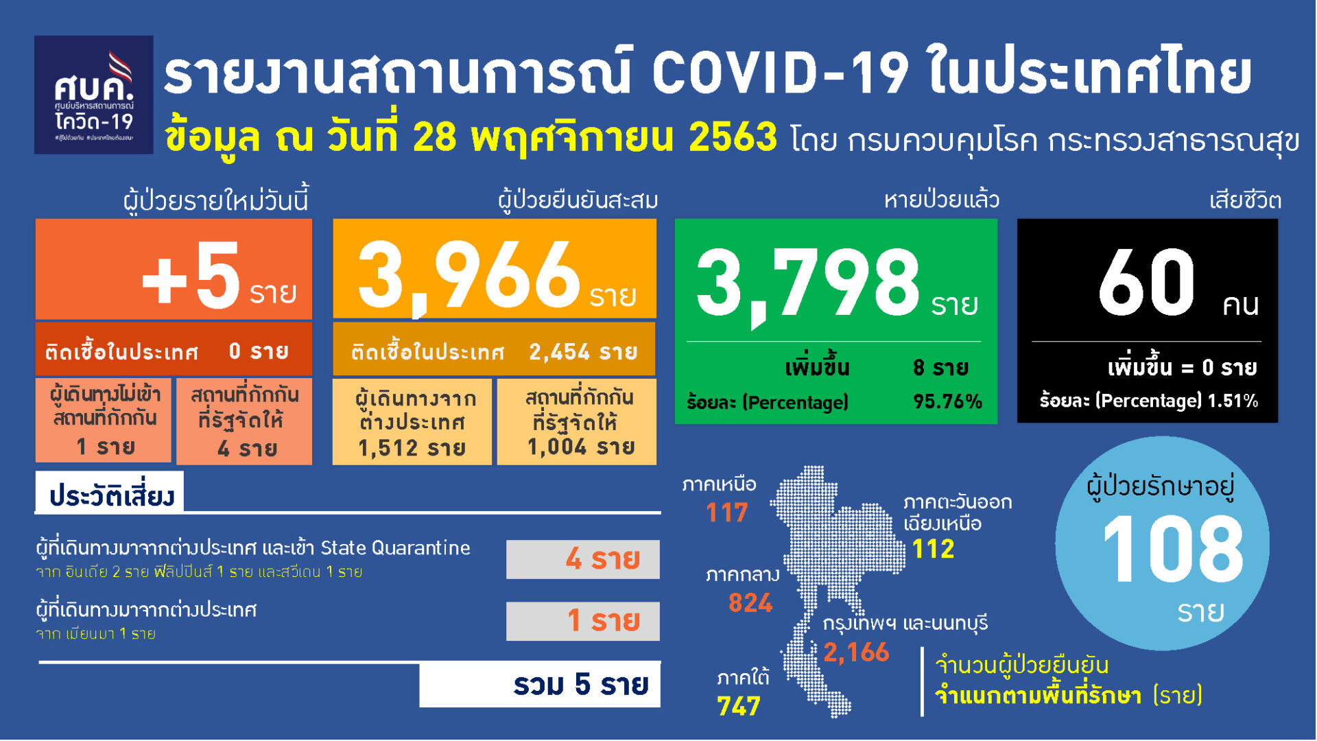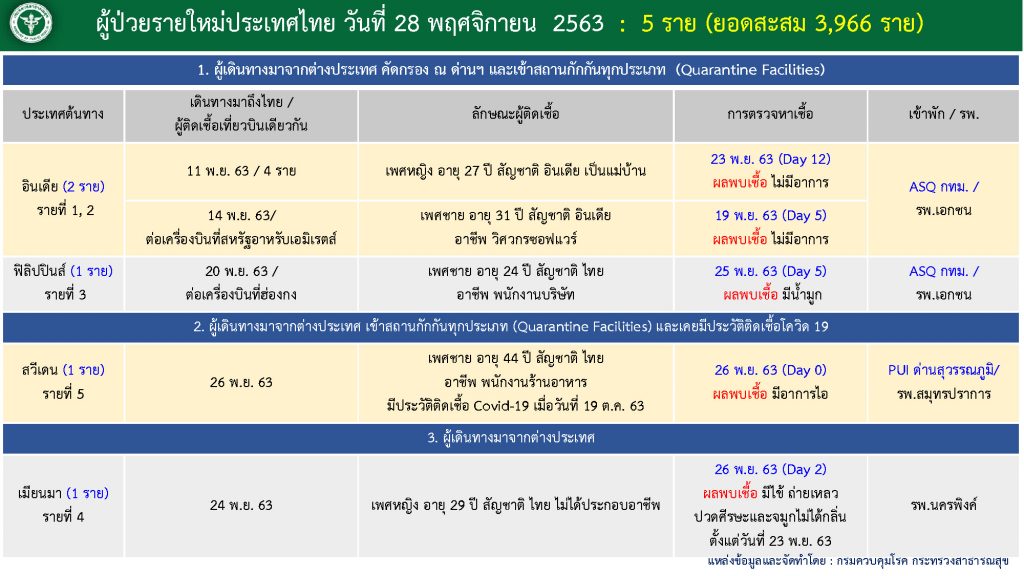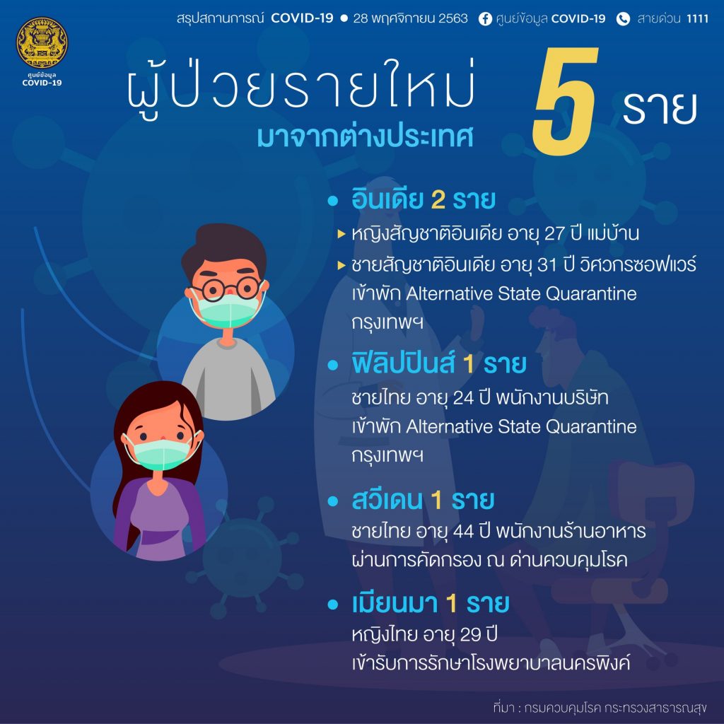 ศูนย์บริหารสถานการณ์แพร่ระบาดของโรคติดเชื้อไวรัสโคโรนา 2019 (ศบค.) รายงานสถานการณ์การติดเชื้อ COVID-19 วันเสาร์ที่ 28 พฤศจิกายน 2563 🕚 เวลา 11.00 น. พบผู้ป่วยรายใหม่ 5 ราย ผู้ป่วยยืนยันสะสม 3,966 ราย หายป่วยแล้ว 3,798 ราย และเสียชีวิตสะสม 60 ราย