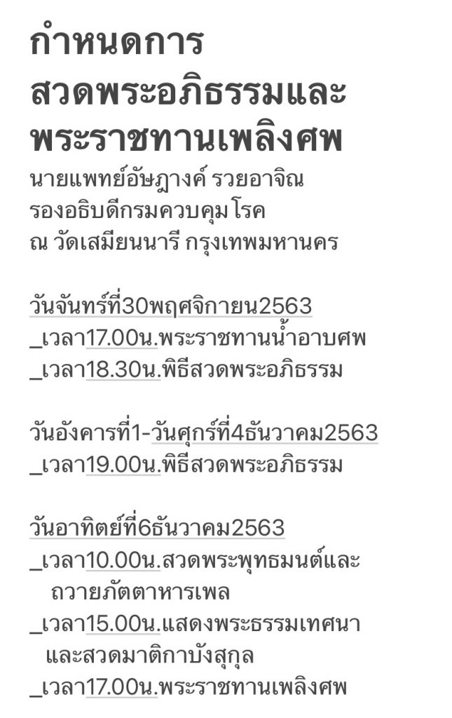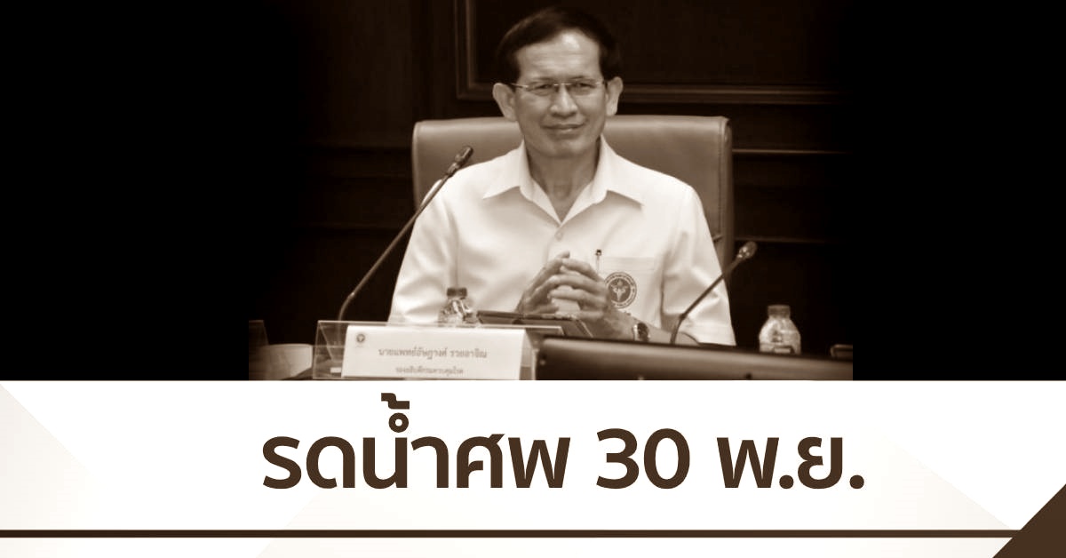 สธ. 29 พ.ย.-จะมีพิธีรดน้ำศพ นายแพทย์อัษฎางค์ รวยอาจิณ รองอธิบดีกรมควบคุมโรค ในวันจันทร์ที่ 30 พฤศจิกายน เวลา 17.00 น. หลังหัวใจล้มเหลว เสียชีวิตขณะร่วมงานวิ่งที่ จ.สิงห์บุรี เช้าวันนี้