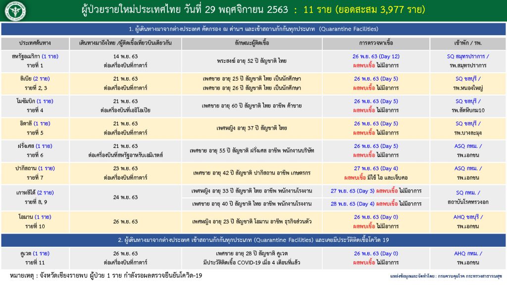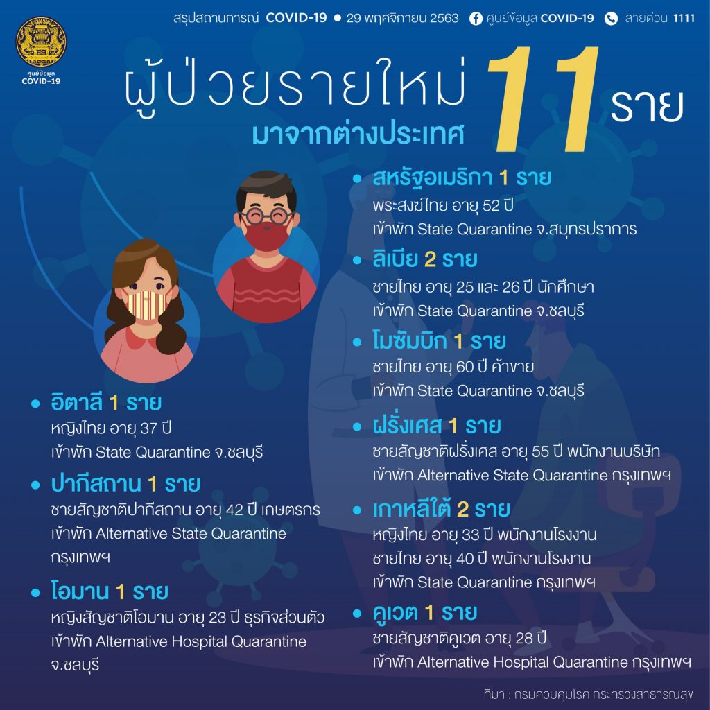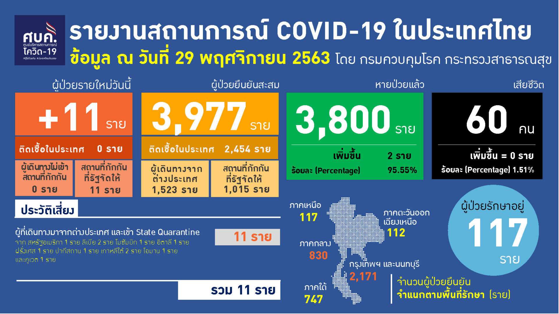ศูนย์บริหารสถานการณ์แพร่ระบาดของโรคติดเชื้อไวรัสโคโรนา 2019 (ศบค.) รายงานสถานการณ์การติดเชื้อโควิด-19 วันอาทิตย์ที่ 29 พฤศจิกายน 2563 เวลา 11.00 น. ผู้ป่วยรายใหม่ 11 ราย ผู้ป่วยยืนยันสะสม 3,977 ราย หายป่วยแล้ว 3,800 ราย เสียชีวิตสะสม 60 ราย