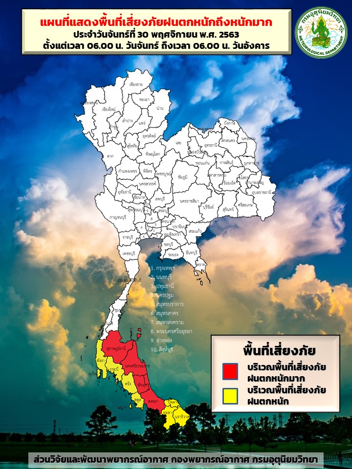 กรมอุตุนิยมวิทยา พยากรณ์อากาศ 24 ชั่วโมงข้างหน้า บริเวณความกดอากาศสูงหรือมวลอากาศเย็นกำลังค่อนข้างแรงยังคงแผ่ลงมาปกคลุมประเทศไทยตอนบนและทะเลจีนใต้ ทำให้บริเวณดังกล่าวมีอากาศเย็นถึงหนาวกับมีลมแรง อุณหภูมิจะลดลง 1-3 องศาเซลเซียส ส่วนยอดดอยและยอดภูมีอากาศหนาว ขอให้ประชาชนบริเวณภาคเหนือ ภาคตะวันออกเฉียงเหนือ และภาคกลางดูแลสุขภาพเนื่องจากสภาพอากาศที่หนาวเย็นลงไว้ด้วย สำหรับมรสุมตะวันออกเฉียงเหนือที่พัดปกคลุมอ่าวไทยและภาคใต้มีกำลังแรง ประกอบกับมีหย่อมความกดอากาศต่ำปกคลุมชายฝั่งประเทศมาเลเซีย ลักษณะเช่นนี้ทำให้ภาคใต้มีฝนตกหนักถึงหนักมากบางแห่ง ขอให้ประชาชนบริเวณภาคใต้ระวังอันตรายจากฝนที่ตกหนักถึงหนักมากไว้ด้วย ซึ่งอาจทำให้เกิดน้ำท่วมฉับพลันและน้ำป่าไหลหลากได้