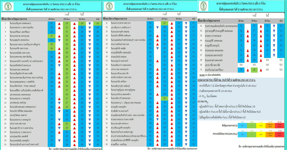 ศูนย์ประสานงานและแก้ไขปัญหามลพิษทางอากาศในกรุงเทพมหานครรายงานสถานการณ์ฝุ่นละอองขนาดไม่เกิน 2.5 ไมครอน (PM 2.5) ของสถานีตรวจวัดคุณภาพอากาศของกรุงเทพมหานคร ประจำวันจันทร์ที่ 30 พฤศจิกายน พ.ศ.2563 เวลา 07.00 น. ค่าเฉลี่ย 24 ชั่วโมง ของฝุ่นละอองขนาดไม่เกิน 2.5 ไมครอน (PM2.5) ตรวจวัดได้ 7-26 ไมโครกรัม/ลูกบาศก์เมตร (มคก./ลบ.ม.) พบว่า ไม่เกินมาตรฐานทุกพื้นที่ที่มีการตรวจวัด (มาตรฐานไม่เกิน 50 มคก./ลบ.ม.)