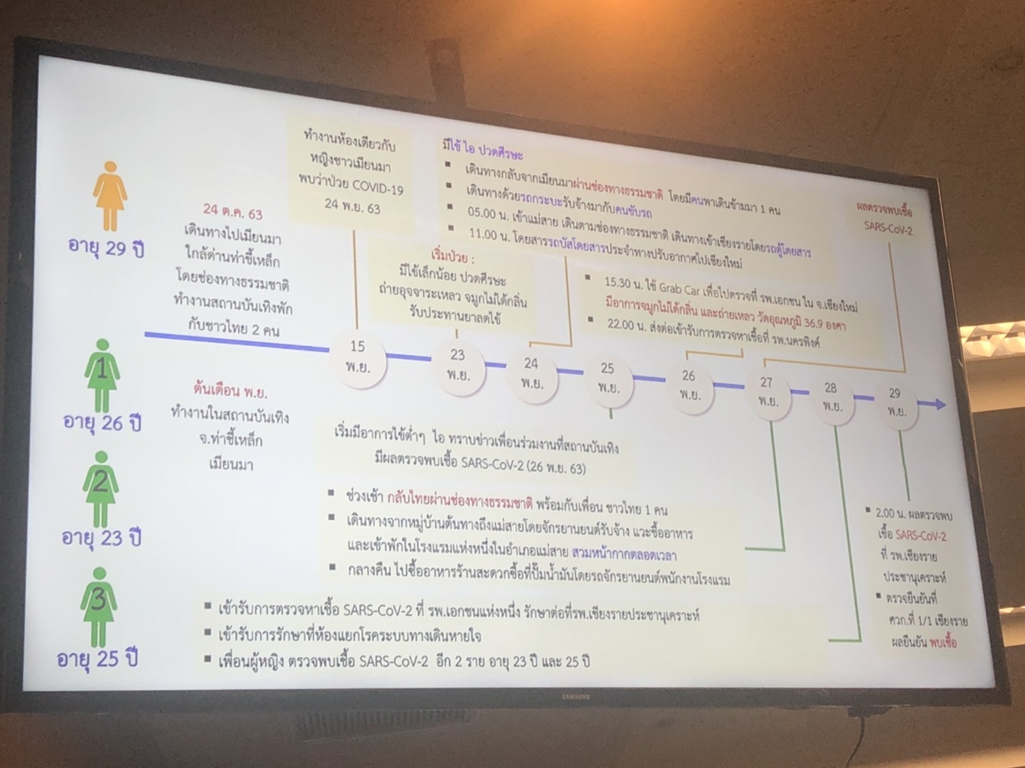 ส่วนไทม์ไลน์ ของหญิงอายุ 25 ปี นี้ นพ.โสภณ กล่าวว่าเดินทางเข้าไทยเมื่อวันที่ 24 พ.ย.จากนั้นพักที่โรงแรมแห่งหนึ่งในแม่สาย แยกกับนอนกับเพื่อน อยู่ในโรงแรมตลอดตั้งแต่วันที่ 24-27 พ.ย.จากนั้นได้ย้ายมาพักในโรงแรมในตัวเมือง จ.เชียงรายในวันที่ 28-30 พ.ย.จากนั้นเมื่อทราบข่าวว่าเพื่อนที่ทำงานเดียวกันป่วยติดเชื้อจึงประสานของเจ้าหน้าที่ตรวจเชื้อ และ นำไปกักตัวที่ 100 อส เมื่อพบว่าป่วย จึงไปรับการรักษาที่ รพ.เชียงรายประชานุเคราะห์ และอาการไม่มาก