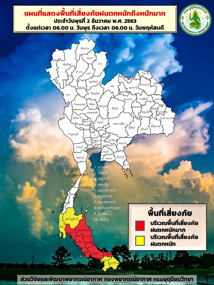 สำหรับมรสุมตะวันออกเฉียงเหนือที่พัดปกคลุมอ่าวไทยและภาคใต้มีกำลังแรง ประกอบกับมีหย่อมความกดอากาศต่ำปกคลุมภาคใต้ตอนล่าง ลักษณะเช่นนี้ทำให้ภาคใต้มีฝนตกหนักถึงหนักมากหลายพื้นที่ ขอให้ประชาชนบริเวณภาคใต้ระวังอันตรายจากฝนที่ตกหนักถึงหนักมากไว้ด้วย ซึ่งอาจทำให้เกิดน้ำท่วมฉับพลัน และน้ำป่าไหลหลากได้ ส่วนคลื่นลมบริเวณอ่าวไทยและทะเลอันดามันมีกำลังแรง โดยอ่าวไทยตอนบนและทะเลอันดามันมีคลื่นสูงประมาณ 2 เมตร และอ่าวไทยตอนล่างคลื่นสูง 2-3 เมตร บริเวณที่มีฝนฟ้าคะนองคลื่นสูงมากกว่า 3 เมตร ขอให้ประชาชนในบริเวณดังกล่าวระวังอันตรายจากคลื่นลมแรงที่ซัดเข้าหาฝั่งและชาวเรือควรเดินเรือ ด้วยความระมัดระวัง รวมทั้งควรหลีกเลี่ยงการเดินเรือบริเวณที่มีฝนฟ้าคะนอง เรือเล็กควรงดออกจากฝั่งจนถึงวันที่ 4 ธ.ค.63