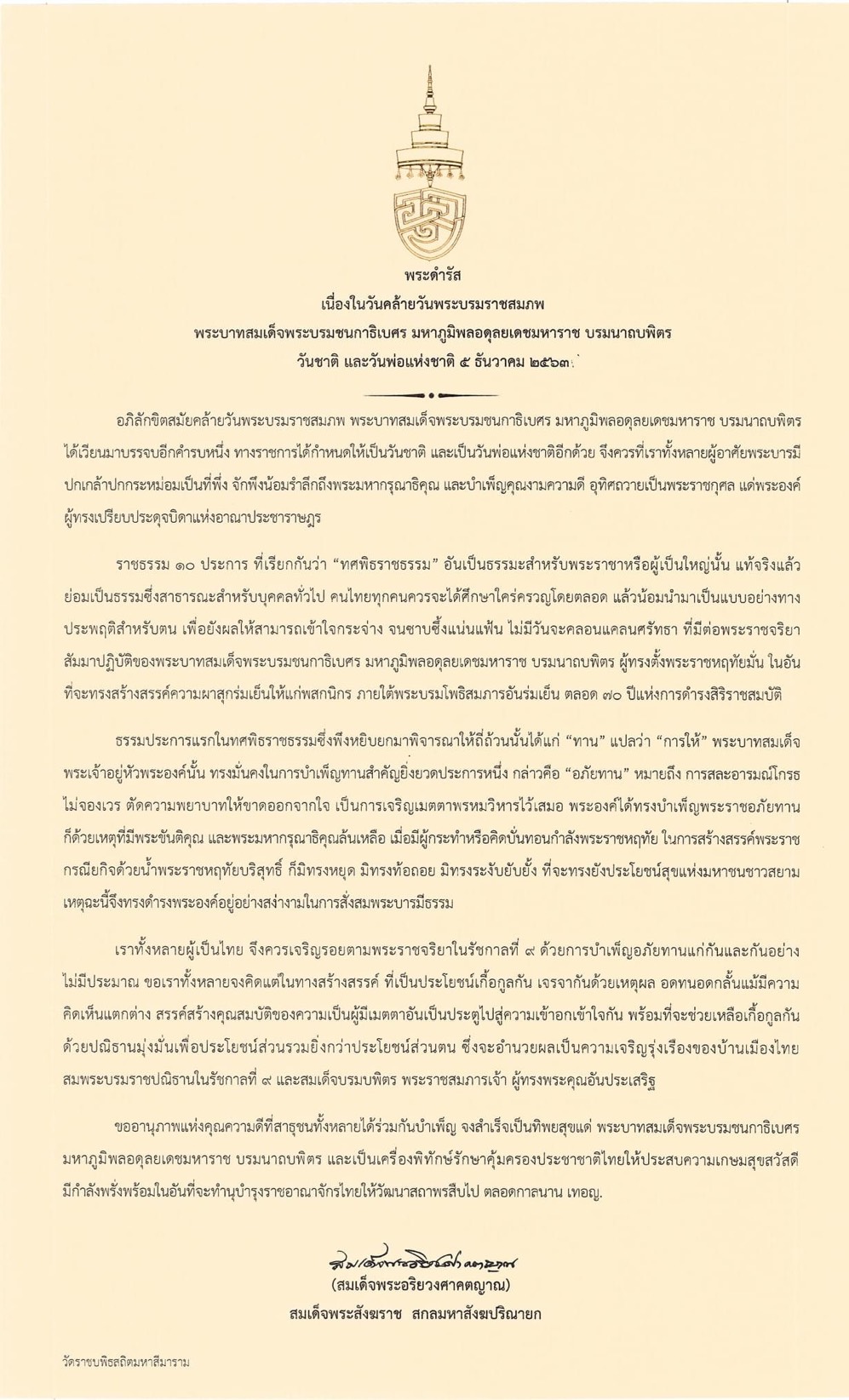 “อภิลักขิตสมัยคล้ายวันพระบรมราชสมภพ พระบาทสมเด็จพระบรมชนกาธิเบศร มหาภูมิพลอดุลยเดชมหาราช บรมนาถบพิตร ได้เวียนมาบรรจบอีกคำรบหนึ่ง ทางราชการได้กำหนดให้เป็นวันชาติ และเป็นวันพ่อแห่งชาติอีกด้วย จึงควรที่เราทั้งหลายผู้อาศัยพระบารมีปกเกล้าปกกระหม่อมเป็นที่พึ่ง จักพึงน้อมรำลึกถึงพระมหากรุณาธิคุณ และบำเพ็ญคุณงามความดี อุทิศถวายเป็นพระราชกุศล แด่พระองค์ผู้ทรงเปรียบประดุจบิดาแห่งอาณาประชาราษฎร