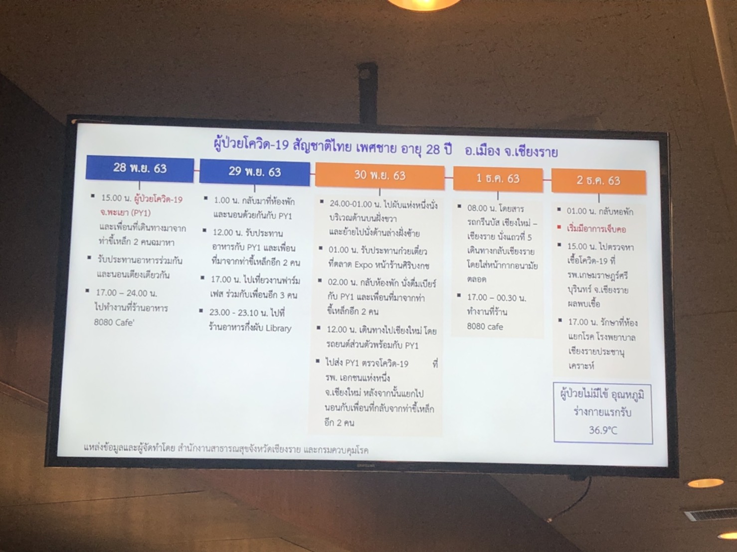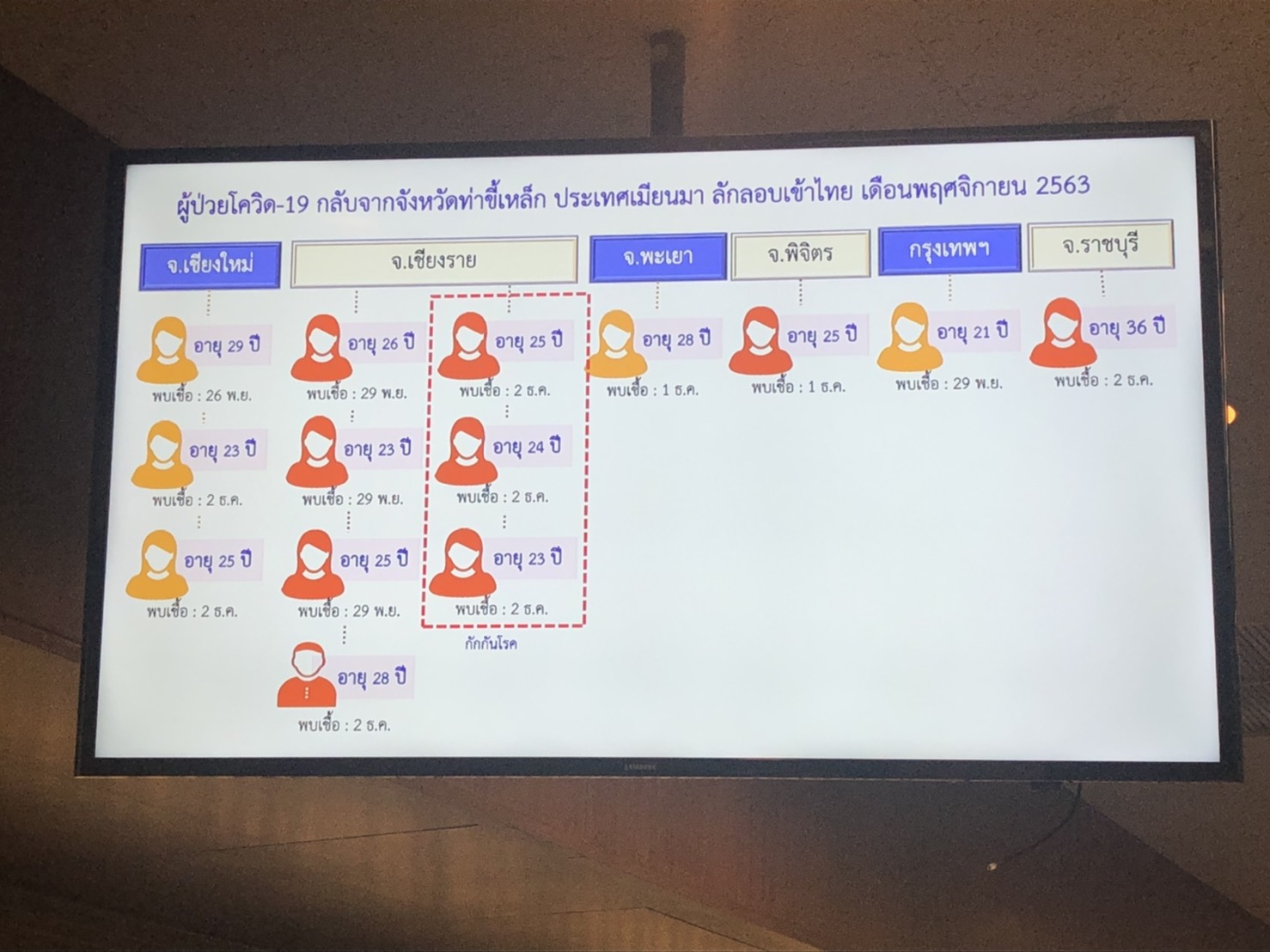 นพ.โอภาส การย์กวินพงศ์ รักษาการอธิบดีกรมควบคุมโรค พร้อมด้วย นพ.โสภณ เอี่ยมศิริถาวร ผู้อำนวยการกองโรคติดต่อทั่วไป กล่าวถึงสถานการณ์โควิด-19 ว่า วันนี้พบผู้ติดเชื้อเพิ่ม 14 คน ในจำนวนนี้เป็นผู้เดินทางมาจากต่างประเทศ และ1 คนเป็นผู้ติดเชื้อในประเทศ โดยในรายติดเชื้อในประเทศนี้ พบว่าเป็นชายอายุ 28 ปี เป็นเพื่อนที่ใกล้ชิดกับเคสหญิงพะเยา อายุ 28 ปี ทำงานสถานบันเทิง จังหวัดท่าขี้เหล็ก เมียนมา มีประวัติเดินทางไปท่องเที่ยวที่งานฟาร์มเฟสติวัลที่สิงห์ปาร์ค ในวันที่ 29 พ.ย.ในเวลา 19.30 น.ในโซนซี คาดว่านั่งโต๊ะที่ 41และยังมีประวัตินอนพักเตียงเดียวกันตลอด โดยมีการสัมผัสใกล้ชิดมากกว่า 48 ชั่วโมง