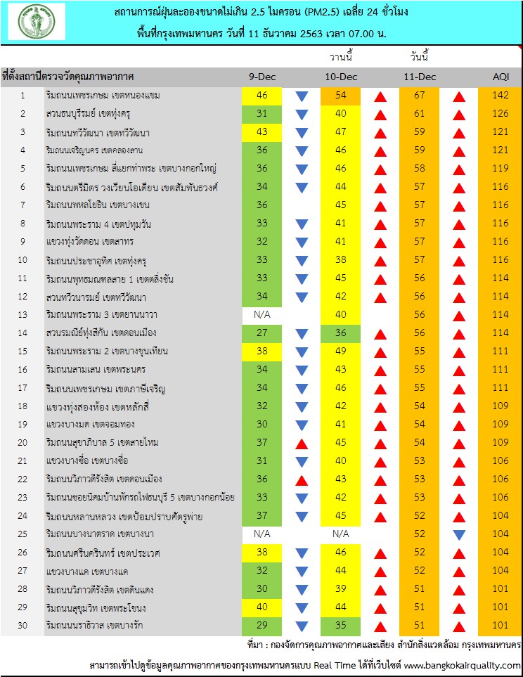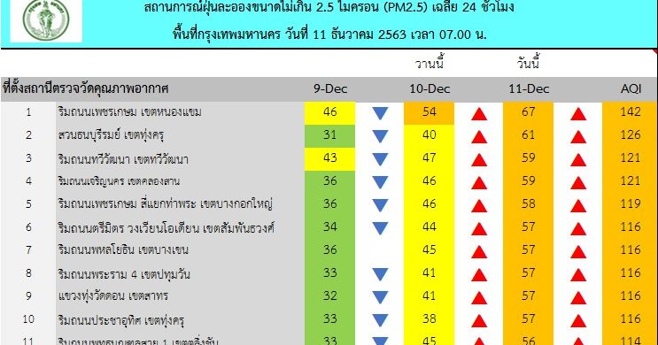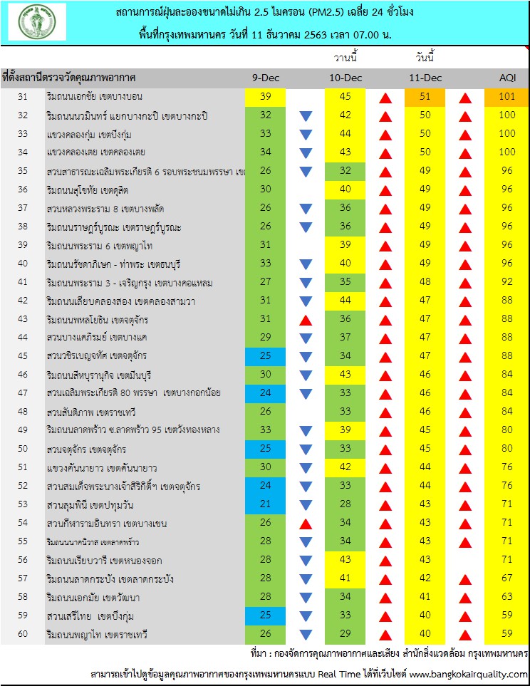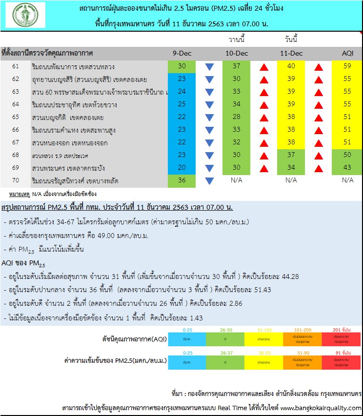 ศูนย์ประสานงานและแก้ไขปัญหามลพิษทางอากาศในกรุงเทพมหานครรายงานสถานการณ์ฝุ่นละอองขนาดไม่เกิน 2.5 ไมครอน (PM 2.5) ของสถานีตรวจวัดคุณภาพอากาศของกรุงเทพมหานคร ประจำวันศุกร์ที่ 11 ธันวาคม พ.ศ. 2563 ค่าเฉลี่ย 24 ชั่วโมง ของฝุ่นละอองขนาดไม่เกิน 2.5 ไมครอน (PM2.5) ตรวจวัดได้ 34-67 ไมโครกรัม/ลูกบาศก์เมตร (มคก./ลบ.ม.) พบว่าเกินมาตรฐาน (มาตรฐานไม่เกิน 50 มคก./ลบ.ม.) จำนวน 31 พื้นที่ คือ
