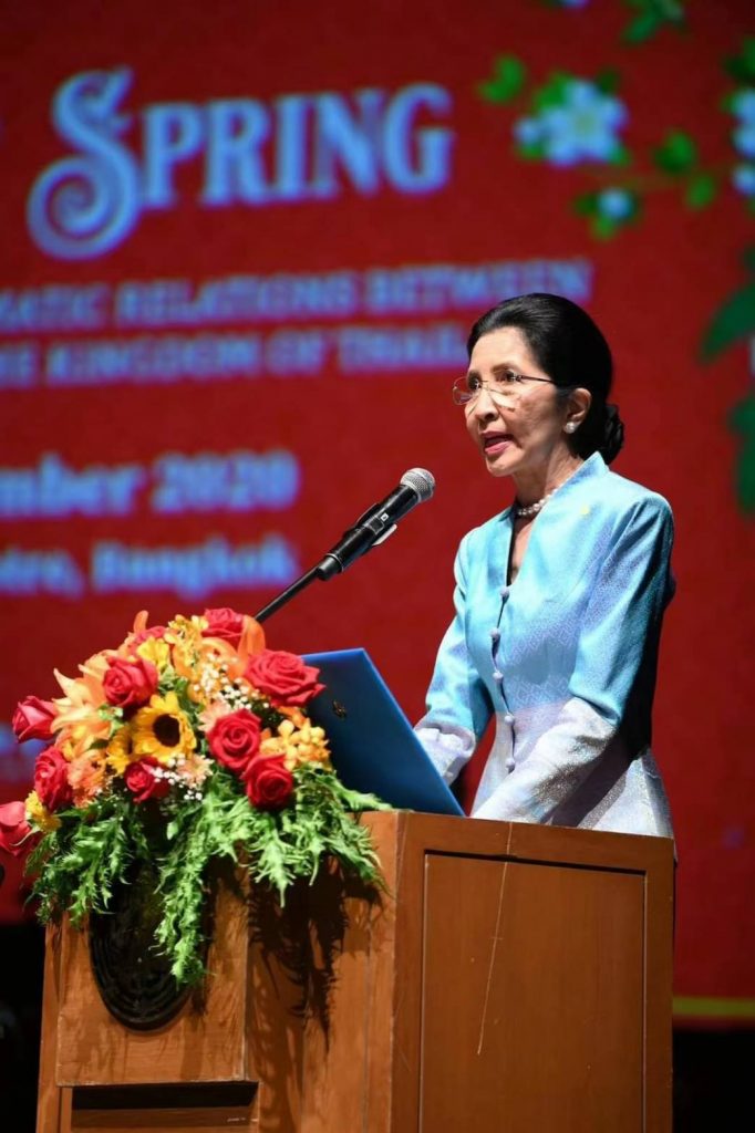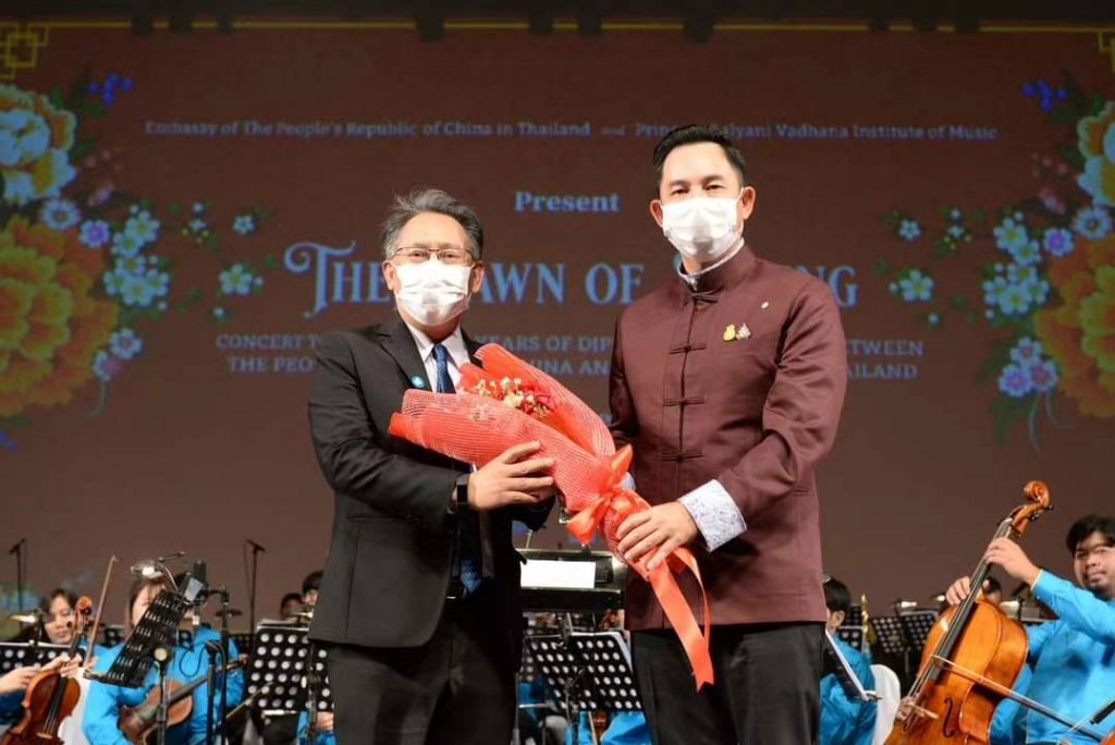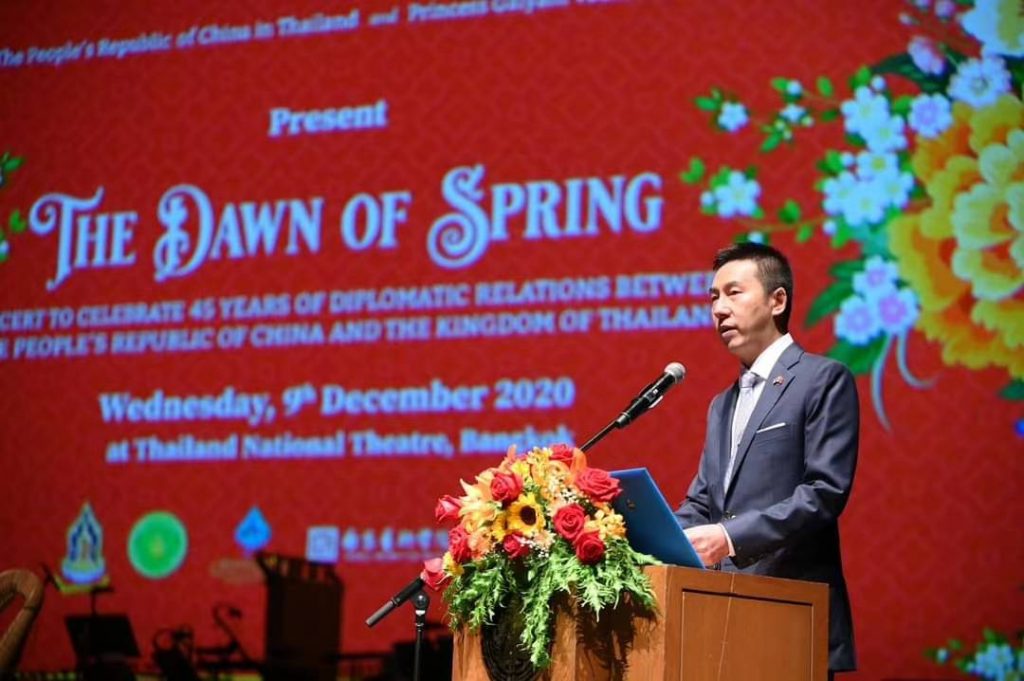 วันที่ 9 ธันวาคม สถานเอกอัครราชทูตสาธารณรัฐประชาชนจีนประจำราชอาณาจักรไทย สถาบันดนตรีกัลยาณิวัฒนา กระทรวงวัฒนธรรมและมหาวิทยาลัยศิลปะแห่งเมืองหนานจิงได้ร่วมกันจัดคอนเสิร์ต “Spring Dawn” จัดขึ้นเพื่อเฉลิมฉลองครบรอบ 45 ปีการสถาปนาความสัมพันธ์ทางการทูตระหว่างจีนและไทย ณ โรงละครแห่งชาติ โดยมีรองศาสตราจารย์ นราพร จันทร์โอชา ที่ปรึกษาสภาสถาบันดนตรีกัลยาณิวัฒนา นายอิทธิพล คุณปลื้ม รัฐมนตรีกระทรวงวัฒนธรรม นายหยาง ซิน รักษาการเอกอัครราชทูตสาธารณรัฐประชาชนจีน ประจำประเทศไทย และคณะทูตต่างประเทศเข้าร่วมงานในครั้งนี้