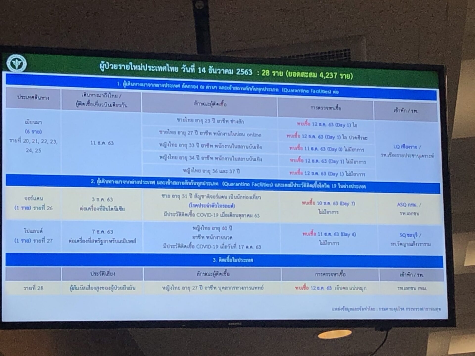 นพ.ทวีศิลป์ วิษณุโยธิน โฆษก ศบค. กล่าวว่า วันนี้ (14 ธ.ค.) พบผู้ป่วยโควิด-19 เพิ่มจำนวน 28 คน ในจำนวนนี้ 27 คนเป็นผู้มีประวัติ เดินทางมาจากต่างประเทศ เข้ารับการรักษาตัวในสถานพยาบาลและก่อนหน้านั้น พักใน SQ , ASQ ได้แก่ สหราชอาณาจักร 3 คน เมียนมา 6 คน ฝรั่งเศส 2 คน บาร์เรน 7 คน โปแลนด์ 2 คน สวีเดน ,ยูเครน ปากีสถาน เยอรมัน,จอร์แดน ,อินโดนีเซีย ,อาเซอร์ไบจาน ประเทศละ 1 คน และมีการติดเชื้อในประเทศ 1 คน เป็นบุคลากรทางการแพทย์ ทำให้มีผู้ป่วยรวม 4,237 คน รักษาหายแล้ว 3,940 คน เสียชีวิตคงที่ 60 คน