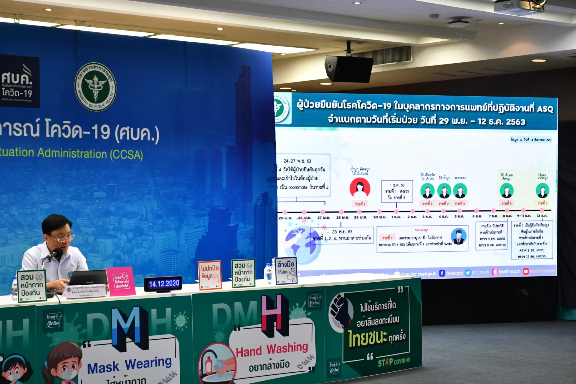 สธ. 14 ธ.ค.-สธ.แจงพบติดเชื้อในประเทศในกลุ่มบุคลากรทางการแพทย์นับเป็นรายที่ 7 สอบสวนโรคพบกินข้าวกับผู้ป่วยรายที่4 นอนพักห้องเดียว กับผู้ป่วยราย ที่ 6 พร้อมแจงสาเหตุห่วงบิ๊กเมาน์เท่น เพราะระยะห่างทำไม่ได้ แถมมีเหล้าเบียร์พ่วง การป้องกันตัวยิ่งลดลง แจงข้อมูล 1 คนปกติสอบสวนไม่ต่ำกว่า 20-40 คน