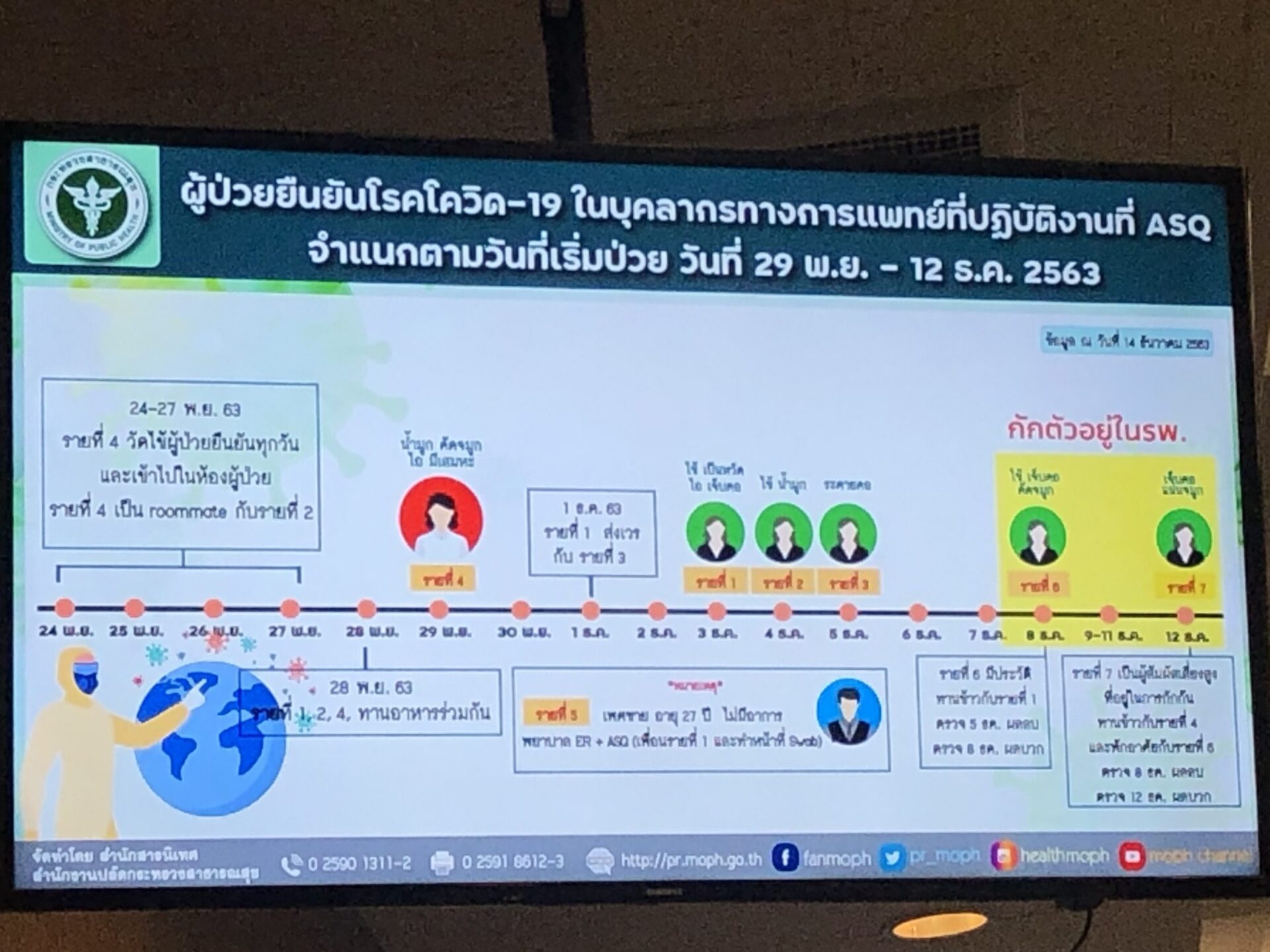 นพ.โสภณ เอี่ยมศิริถาวร ผู้อำนวยการโรคติดต่อทั่วไป กรมควบคุมโรค กระทรวงสาธารณสุข กล่าวว่า จากการสอบสวนโรคหลังพบผู้ป่วยติดเชื้อโควิด-19 ในประเทศ โดยผู้ป่วยรายนี้เป็นหญิงอายุ 27 ปี นับเป็นผู้ป่วยรายที่ 7 ทำงานในสถานพยาบาลเดียวกันกับเพื่อนคนอื่น ๆ ที่ป่วย สอบประวัติพบว่า มีการรับประทานอาหารร่วมกับเพื่อนรายที่ 4 นอนพักในคอนโดมิเนียมเดียวกันกับเพื่อนรายที่ 6 และจัดอยู่ในกลุ่มผู้ป่วยเสี่ยงสูง 51 คน จึงเข้ารับการกักตัวตั้งแต่วันที่ 8 ธ.ค. ตรวจเชื้อครั้งแรกไม่พบ จนมาตรวจครั้งที่ 2 เมื่อวันที่ 12 ธ.ค. พบติดเชื้อ โดยมีอาการคัดจมูก ซึ่งจากการสอบสวนโรคถือว่ารายนี้มีความเสี่ยงในการแพร่โรคน้อยมากเพราะถูกกักตัวตั้งแต่ต้น