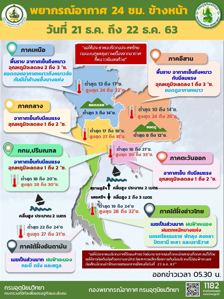 กรมอุตุนิยมวิทยา พยากรณ์อากาศ 24 ชั่วโมงข้างหน้า บริเวณความกดอากาศสูงหรือมวลอากาศเย็นกำลังค่อนข้างแรงอีกระลอกจากประเทศจีนได้แผ่ลงมาปกคลุม ถึงประเทศไทยตอนบนแล้ว ลักษณะเช่นนี้จะทำให้ประเทศไทยตอนบนมีอุณหภูมิลดลงอีก 1-3 องศาเซลเซียส และมีอากาศเย็นถึงหนาวกับมีลมแรง ส่วนบริเวณยอดดอยและยอดภูมีอากาศหนาวถึงหนาวจัด ขอให้ประชาชนบริเวณประเทศไทยตอนบนดูแลสุขภาพเนื่องจากอากาศที่หนาวเย็นลงด้วย
