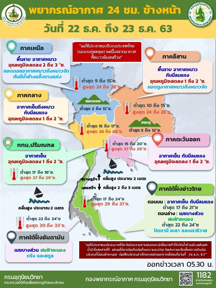 กรมอุตุนิยมวิทยา พยากรณ์อากาศ 24 ชั่วโมงข้างหน้า บริเวณความกดอากาศสูงหรือมวลอากาศเย็นกำลังแรงจากประเทศจีนแผ่ปกคลุมประเทศไทยตอนบน ลักษณะเช่นนี้ทำให้ประเทศไทยตอนบนมีอากาศเย็นถึงหนาวกับมีลมแรง โดยอุณหภูมิจะลดลงอีก 2-3 องศาเซลเซียสในภาคเหนือ ส่วนภาคตะวันออกเฉียงเหนือ ภาคกลาง และภาคตะวันออกอุณหภูมิจะลดลงอีก 1-2 องศาเซลเซียส ส่วนบริเวณยอดดอยและยอดภูมีอากาศหนาวถึงหนาวจัดกับมีน้ำค้างแข็งบางพื้นที่ ขอให้ประชาชนบริเวณประเทศไทยตอนบนดูแลสุขภาพเนื่องจากอากาศที่หนาวเย็นลงไว้ด้วย
