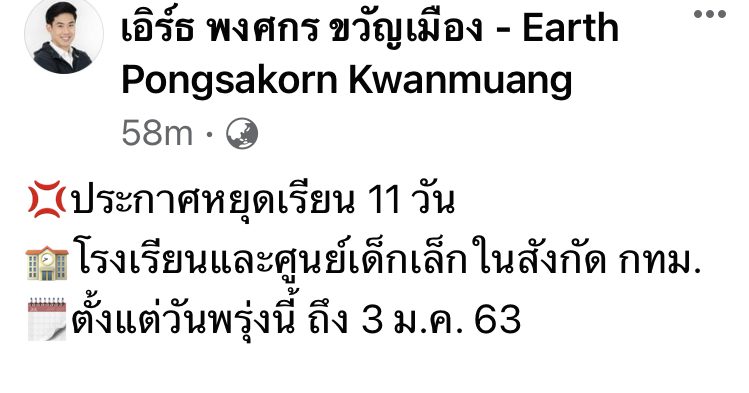 ร.ต.อ.พงศกร ขวัญเมือง โฆษกกรุงเทพมหานคร โพสต์ผ่านเพจเฟซบุ๊ก “เอิร์ธ พงศกร ขวัญเมือง” วันนี้ (23 ธ.ค.) ว่า ประกาศหยุดเรียน 11 วัน โรงเรียนและศูนย์เด็กเล็กในสังกัด กทม.ตั้งแต่วันพรุ่งนี้ ถึง 3 ม.ค.64