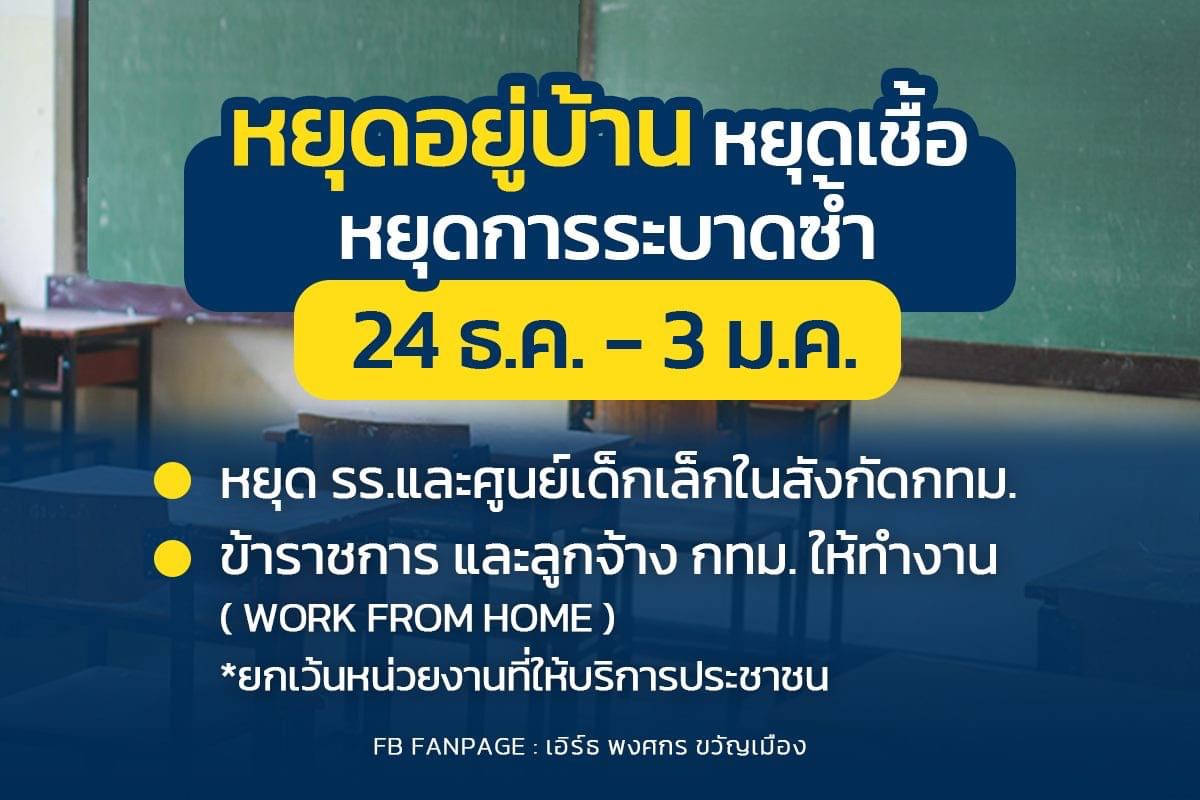 หยุดโรงเรียน 437 โรงเรียน และศูนย์เด็กเล็ก 292 แห่ง และให้ข้าราชการและลูกจ้าง กทม.ทำงานที่บ้าน (Work From Home) ยกเว้นข้าราชการที่ต้องปฏิบัติงานในหน่วยงานที่ให้บริการประชาชน ตั้งแต่วันพรุ่งนี้ 24 ธ.ค. 63 – 3 ม.ค.64 และขอความร่วมมือหน่วยงานรัฐอื่น ให้ทำงานที่บ้านด้วย
