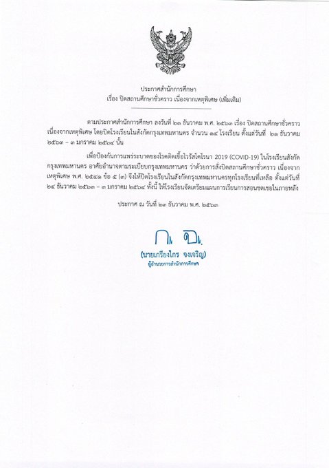 ด้านนายเกรียงไกร จงเจริญ ผู้อำนวยการสำนักการศึกษา ลงนามในประกาศสำนักการศึกษา เรื่องปิดสถานศึกษาชั่วคราว เนื่องจากเหตุพิเศษ(เพิ่มเติม) โดยระบุว่า ตามประกาศสำนักการศึกษา ลงวันที่ 23 ธันวาคม 2563 เรื่องปิดสถานศึกษาชั่วคราว เนื่องจากเหตุพิเศษ โดยปิดโรงเรียนในสังกัดกรุงเทพมหานคร จำนวน 14 โรงเรียน ตั้งแต่วันที่ 23 ธันวาคม 2563 -3 มกราคม 2564 นั้น