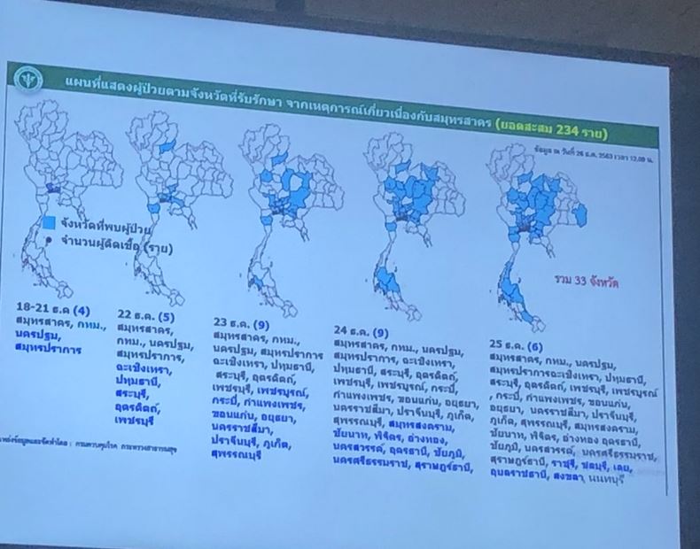 นพ.โอภาส กล่าวย้ำว่า การเดินทางกลับภูมิลำเนาในช่วงเทศกาลปีใหม่ ยังสามารถทำได้ตามปกติ ยกเว้นที่ จ.สมุทรสาคร ที่กำหนดให้เป็นพื้นที่ควบคุมสูงสุด ควรเข้าออกตามความจำเป็น ส่วนพื้นที่อื่นยังเดินทางได้ ขอแค่การสวมหน้ากากอนามัย หมั่นล้างมือ และมีระยะห่าง พร้อมกล่าวว่า ขณะนี้พบผู้ป่วยรวม 234 คน กระจายไปใน 33 จังหวัด และคาดว่าในเย็นวันนี้ ผู้ว่าราชการจังหวัดประกาศจำนวนผู้ป่วยหรือและยกระดับควบคุมในพื้นที่เพิ่มเติม เช่น กทม.มีผู้ติดเชื้อที่สัมพันธ์กับ จ.สมุทรสาคร รวม 77 คน สมุทรปราการ 18 คน นนทบุรี 3 คน เพชรบุรี 12 คน สมุทรสงคราม 11 คน สระบุรีและกระบี่ จังหวัดละ 8 คน นครปฐมและฉะเชิงเทรา จังหวัดละ 7 คน จะเห็นว่าส่วนใหญ่อยู่ในพื้นที่รอบภาคกลาง ไม่ไกลจากสมุทรสาครมากนัก แต่ในจังหวัดที่ไกลออกไป เช่น ชัยภูมิ พิจิตร ส่วนใหญ่จะพบผู้ป่วยเพียง 1-2 คน