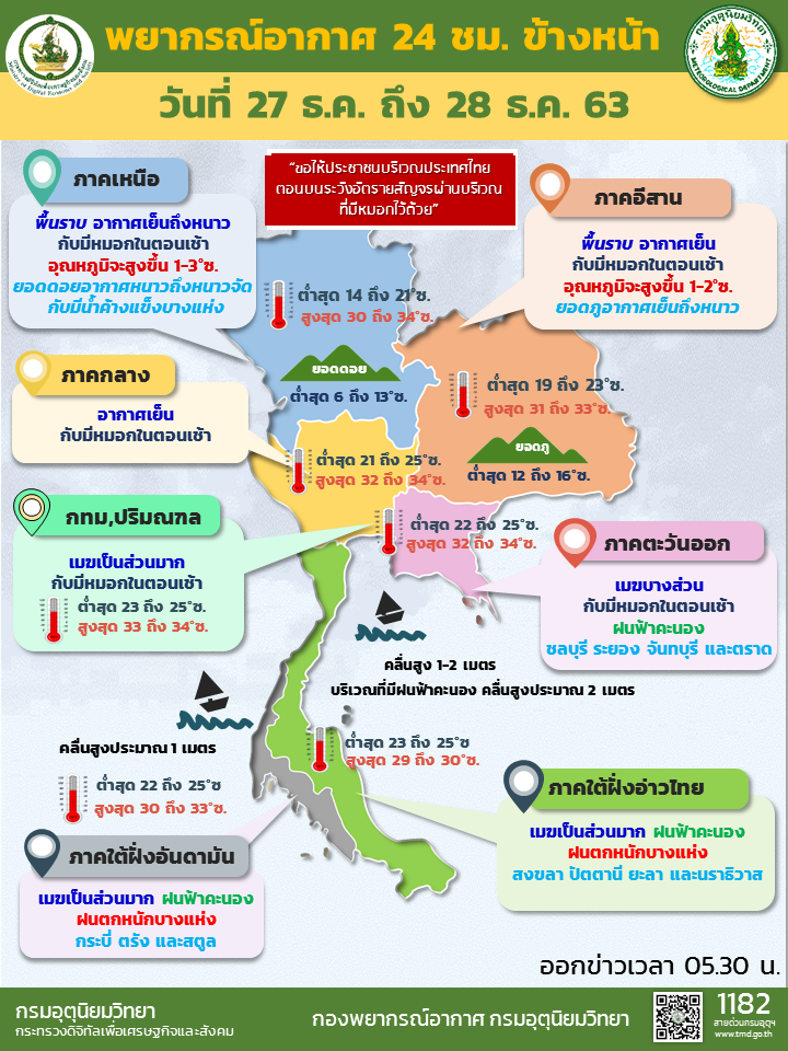 กรมอุตุนิยมวิทยา พยากรณ์อากาศ 24 ชั่วโมงข้างหน้า บริเวณความกดอากาศสูงหรือมวลอากาศเย็นที่ปกคลุมประเทศไทยตอนบนและทะเลจีนใต้มีกำลังอ่อนลงอีก ทำให้บริเวณดังกล่าวมีอุณหภูมิสูงขึ้น 1-3 องศาเซลเซียส กับมีหมอกในตอนเช้า แต่ยังคงมีอากาศเย็นถึงหนาวในภาคเหนือและภาคตะวันออกเฉียงเหนือ ส่วนบริเวณยอดดอยและยอดภูมีอากาศหนาวถึงหนาวจัดและมีน้ำค้างแข็งบางพื้นที่ ขอให้ประชาชนบริเวณประเทศไทยตอนบนระวังอันตรายในการสัญจรผ่านบริเวณ ที่มีหมอกไว้ด้วย สำหรับมรสุมตะวันออกเฉียงเหนือยังคงพัดปกคลุมอ่าวไทยและภาคใต้ ทำให้ภาคใต้ยังคงมีฝนตกต่อเนื่อง และมีฝนตกหนักบางแห่งส่วนมากทางตอนล่างของภาค