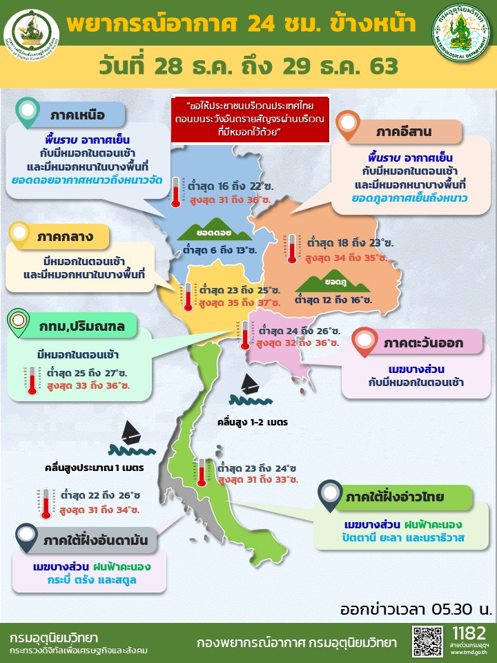 กรมอุตุนิยมวิทยา พยากรณ์อากาศ 24 ชั่วโมงข้างหน้า บริเวณความกดอากาศสูงหรือมวลอากาศเย็นกำลังอ่อนปกคลุมประเทศไทยตอนบนและทะเลจีนใต้ ทำให้บริเวณดังกล่าวมีหมอกในตอนเช้าและมีหมอกหนาในบางพื้นที่ แต่ยังคงมีอากาศเย็นในภาคเหนือและภาคตะวันออกเฉียงเหนือ ส่วนบริเวณยอดดอยและยอดภูมีอากาศหนาวถึงหนาวจัด ขอให้ประชาชนบริเวณประเทศไทยตอนบนระวังอันตรายในการสัญจรผ่านบริเวณที่มีหมอกหนาไว้ด้วย สำหรับมรสุมตะวันออกเฉียงเหนือกำลังอ่อนพัดปกคลุมอ่าวไทยและภาคใต้ ทำให้ภาคใต้มีฝนน้อยในระยะนี้