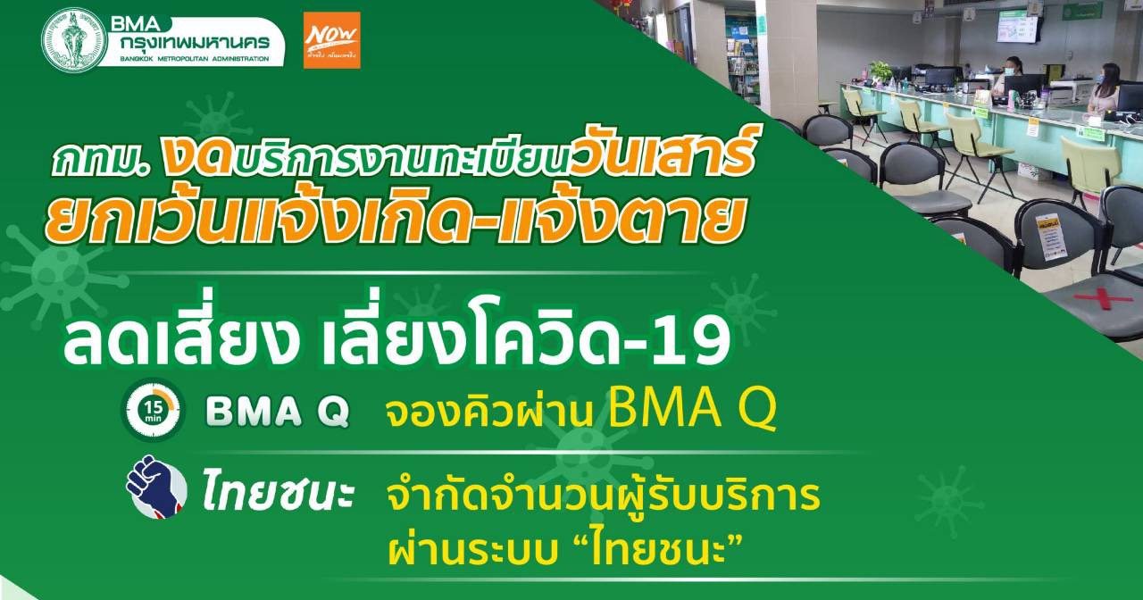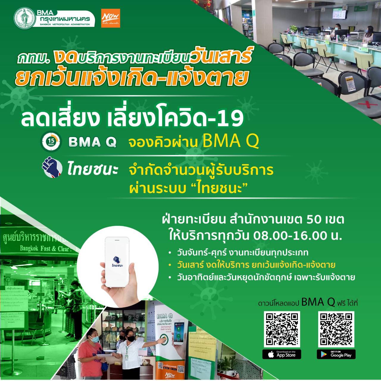 นางศิลปสวย ระวีแสงสูรย์ ปลัดกรุงเทพมหานคร เปิดเผยว่า ด้วยสถานการณ์การแพร่ระบาดของโรคติดเชื้อไวรัสโคโรนา 2019 (COVID-19) ซึ่งปัจจุบันพบผู้ติดเชื้อรายใหม่เพิ่มขึ้นจำนวนมาก โดยเฉพาะในจังหวัดที่มีพื้นที่ติดต่อกับกรุงเทพมหานคร โดยในสถานการณ์ดังกล่าวฝ่ายทะเบียน สำนักงานเขต ทั้ง 50 เขต ยังคงเปิดให้บริการประชาชนและมีประชาชนมารับบริการเป็นจำนวนมาก จึงมีความเสี่ยงที่จะทำให้เกิดการแพร่ระบาดของโรคอย่างรวดเร็ว เพื่อเป็นการป้องกันการแพร่ระบาดของโรคในพื้นที่กรุงเทพมหานคร จึงของดให้บริการงานทะเบียนแก่ประชาชนในวันเสาร์ในทุกกรณี ยกเว้นการแจ้งเกิด-ตาย รวมทั้งงดให้บริการรถบริการงานทะเบียนเคลื่อนที่ (Bangkok Mobile Service) ตั้งแต่บัดนี้เป็นต้นไป จนกว่าสถานการณ์การแพร่ระบาดจะคลี่คลายซึ่งจะประชาสัมพันธ์ให้ทราบต่อไป