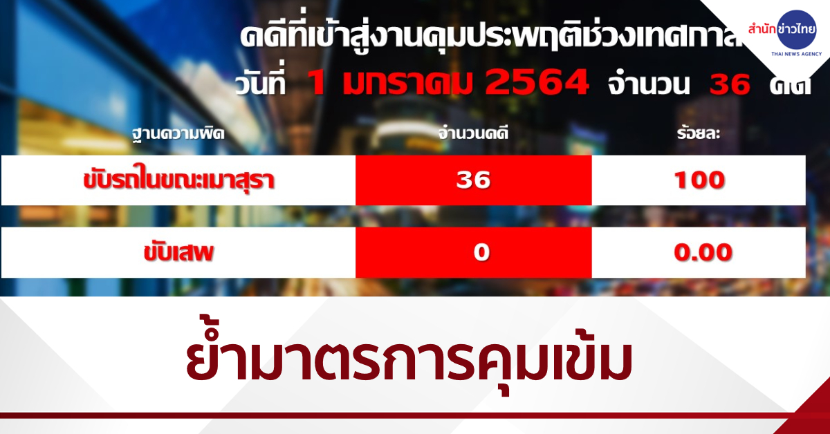 นายวิตถวัลย์ สุนทรขจิต อธิบดีกรมคุมประพฤติ เปิดเผยสถิติคดีขับรถในขณะเมาสุราที่ศาลสั่งคุมความประพฤติ ต้อนรับวันปีใหม่ ประจำวันที่ 1 มกราคม 2564 มีเพียง 36 คดี เนื่องจากศาลปิดทำการ ทำให้ตัวเลขสถิติยอดรวม 4 วันที่มีการควบคุมเข้มงวด (29 ธันวาคม 2563-1 มกราคม 2564) มีจำนวนทั้งสิ้น 1,028 คดี จำแนกเป็นคดีขับรถขณะเมาสุรา จำนวน 911 คดี คิดเป็นร้อยละ 88.62. คดีขับเสพ จำนวน 100 คดี คิดเป็นร้อยละ 9.73 คดีขับรถประมาท จำนวน 17 คดี คิดเป็นร้อยละ 1.65