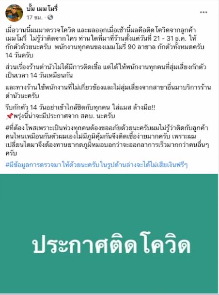 โพสต์ดังกล่าวระบุว่า “เมื่อวานนี้ ผมมาตรวจโควิด และผลออกเมื่อเช้านี้ผลคือติดโควิดจากลูกค้าเมมโมรี่ ไม่รู้ว่าติดจากใคร ท่านใดที่มาที่ร้านตั้งแต่วันที่ 21-31 ธ.ค. ให้กักตัวด้วยนะครับ พนักงานทุกคนของเมมโมรี่ 90 ลาซาล กักตัวทั้งหมดครับ 14 วันครับ