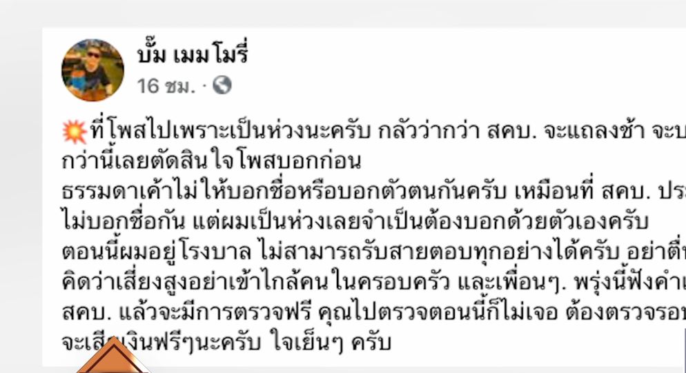 ล่าสุดเจ้าของร้านคนเดิมได้โพสต์อีก ระบุว่า “ที่โพสต์ไปเพราะเป็นห่วงนะครับ กลัวว่า ศบค.แถลงช้า จะบานปลายไปกว่านี้ เลยตัดสินใจโพสต์บอกก่อน ธรรมดาเค้าไม่ให้บอกชื่อหรือบอกตัวตนกันครับ ตอนนี้ผมอยู่โรงพยาบาล ไม่สามารถรับสายได้ อย่าตื่นนะครับ ถ้าคิดว่าเสี่ยงสูง อย่าเข้าใกล้คนในครอบครัวและเพื่อนๆ ฟังคำแนะนำจาก ศบค. แล้วจะมีการตรวจฟรี คุณไปตรวจตอนนี้ก็ไม่เจอ ต้องตรวจรอบ 2 อีกคุณจะเสียเงินฟรีๆ นะครับใจเย็นๆ ครับ” . – สำนักข่าวไทย