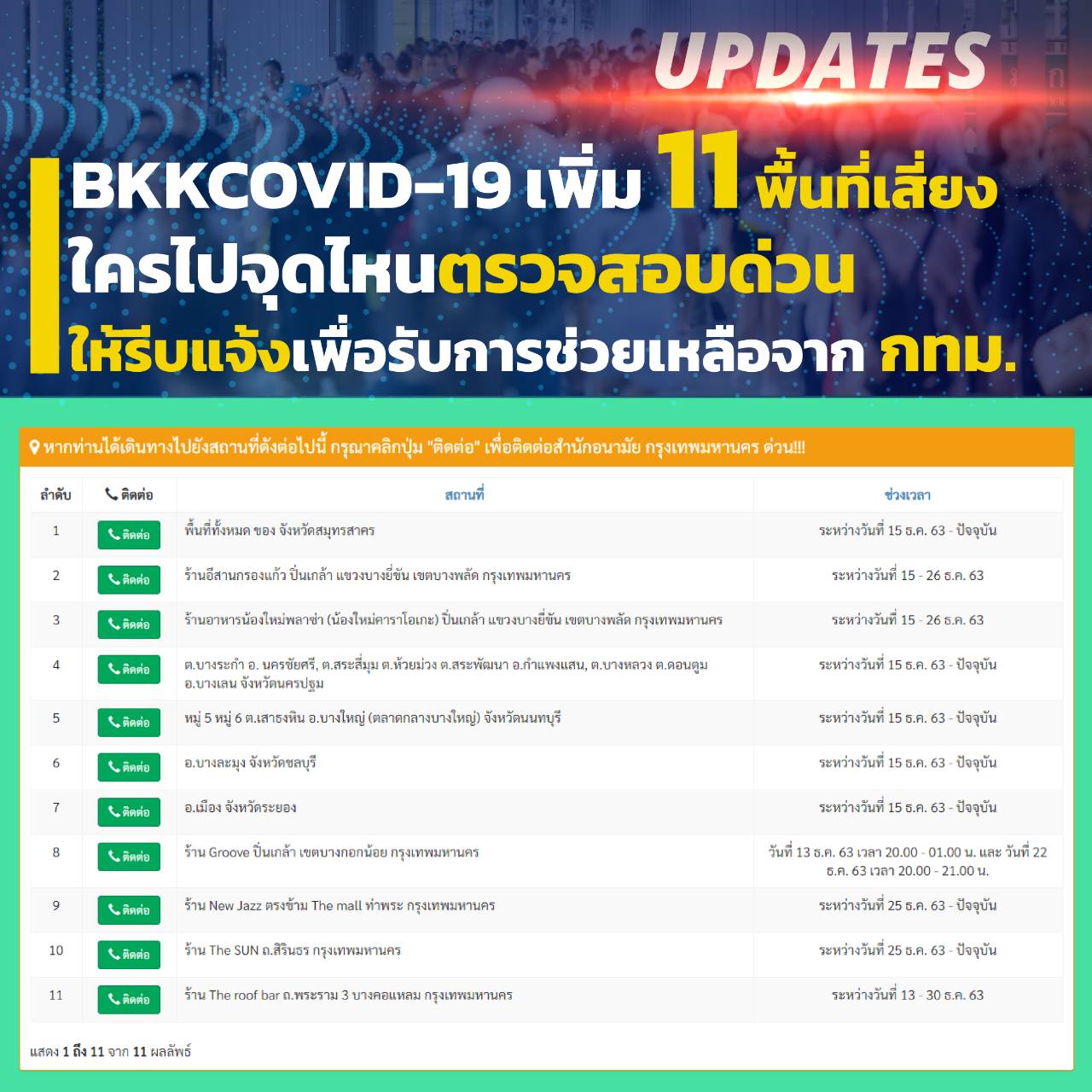 เพจเฟซบุ๊ก กรุงเทพมหานคร โดยสำนักงานประชาสัมพันธ์ โพสต์วันนี้ (5 ธ.ค.) แจ้งว่า ด่วน! ใครเคยเดินทางไปจุด 11 พื้นที่เสี่ยง เข้าระบบ BKKcovid19 http://bkkcovid19.bangkok.go.th/ กทม.จะจัดเจ้าหน้าที่ติดต่อไปโดยเร็วที่สุด