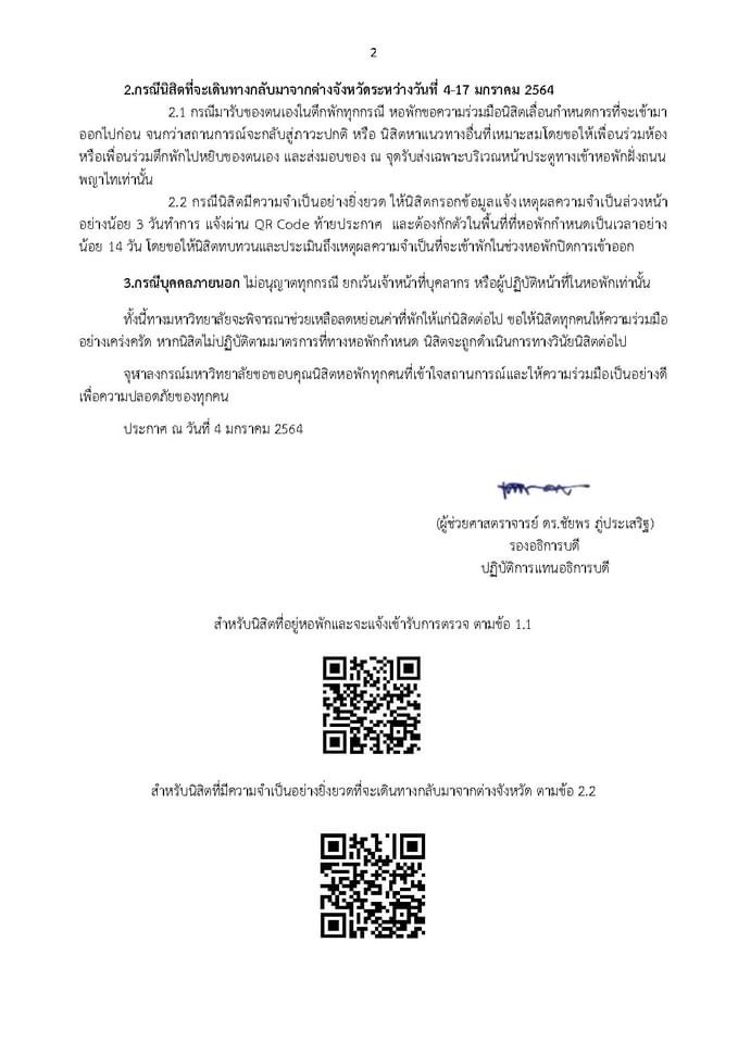 2.2 กรณีนิสิตมีความจำเป็นอย่างยิ่งยวด ให้นิสิตกรอกข้อมูลแจ้งเหตุผลความจำเป็นล่วงหน้า อย่างน้อย 3 วันทำการ แจ้งผ่านคิวอาร์โค้ดท้ายประกาศและต้องกักตัวในพื้นที่ที่หอพักกำหนดเป็นเวลาอย่างน้อย 14 วัน โดยขอให้นิสิตทบทวนและประเมินเหตุผลความจำเป็น ที่จะเข้าหอพัก ปิดการเข้าออก