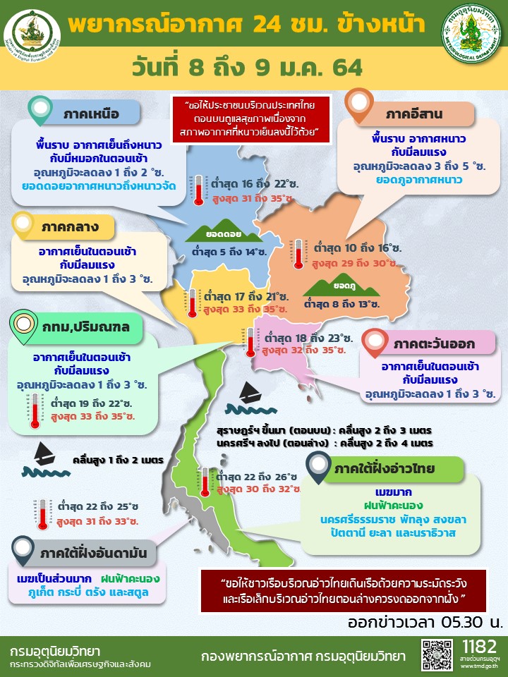 กรมอุตุนิยมวิทยา พยากรณ์อากาศ 24 ชั่วโมงข้างหน้า ภาคตะวันออกเฉียงเหนือมีอากาศหนาวเย็นลง กับมีลมแรง และอุณหภูมิลดลง 3-5 องศาเซลเซียส เนื่องจากบริเวณความกดอากาศสูงหรือมวลอากาศเย็นกำลังแรงจากประเทศจีนได้แผ่เข้ามาปกคลุมภาคตะวันออกเฉียงเหนือของประเทศไทยแล้ว และจะเข้าปกคลุมภาคเหนือ ภาคกลาง และภาคตะวันออก ในวันนี้ (8 ม.ค.) ทำให้บริเวณดังกล่าวมีอากาศหนาวเย็นลง กับมีลมแรง และอุณหภูมิลดลง 1-3 องศาเซลเซียส ขอให้ประชาชนบริเวณดังกล่าวดูแลสุขภาพ เนื่องจากสภาพอากาศที่หนาวเย็นลง
