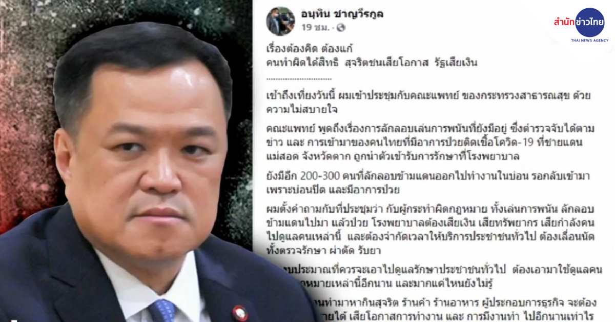กรุงเทพฯ 10 ม.ค. – กรณีนายอนุทิน ชาญวีรกูล รัฐมนตรีว่าการกระทรวงสาธารณสุข เตรียมชงยกเลิกการรักษาฟรีให้ผู้ติดเชื้อโควิด-19 จากบ่อนและลักลอบเข้าเมือง ขณะที่แพทย์จากจุฬาฯ ระบุว่า หากผลักดันนโยบายนี้ จะส่งผลกระทบต่อการควบคุมการแพร่ระบาดโรค เพราะผู้ติดเชื้อที่กระทำผิดกฎหมายอาจหลบเลี่ยงการเข้าสู่ระบบการรักษา จนแพร่กระจายเชื้อไปทั่ว. – สำนักข่าวไทย