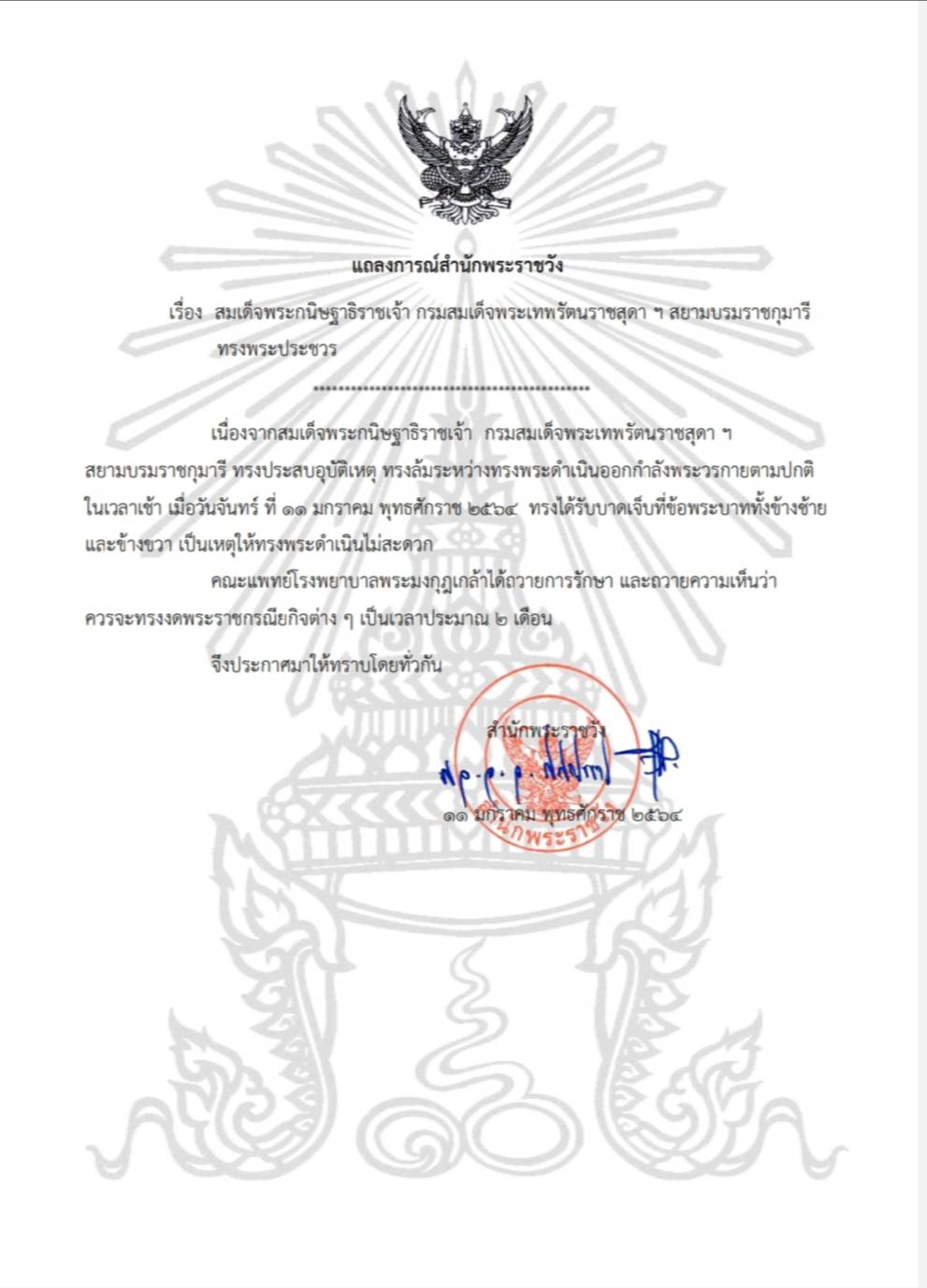เนื่องจากสมเด็จพระกนิษฐาธิราชเจ้า กรมสมเด็จพระเทพรัตนราชสุดา ฯ สยามบรมราชกุมารี ทรงประสบอุบัติเหตุ ทรงล้มระหว่างทรงพระดําเนินออกกําลังพระวรกายตามปกติในเวลาเช้า เมื่อวันจันทร์ที่ 11 มกราคม พุทธศักราช 2564 ทรงได้รับบาดเจ็บที่ข้อพระบาททั้งข้างซ้ายและข้างขวา เป็นเหตุให้ทรงพระดําเนินไม่สะดวก