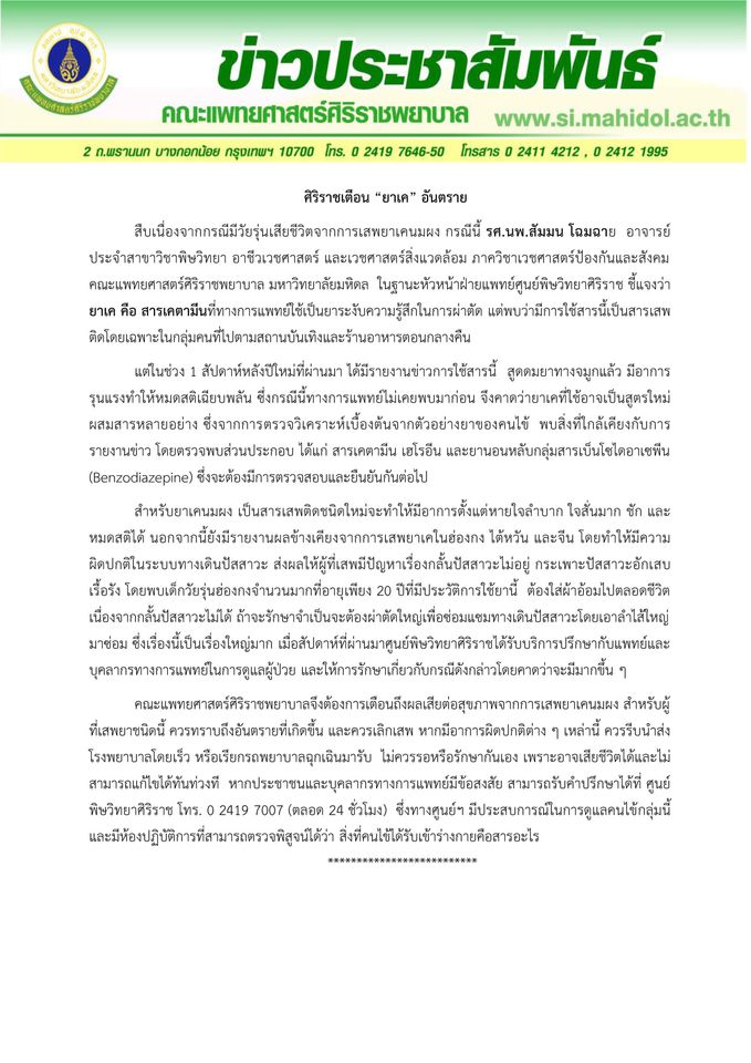 รพ.ศิริราช 13 ม.ค.- แพทย์ศิริราชย้ำผลกระทบจากการเสพยาเคนมผง รุนแรงถึงเสียชีวิต โดยศูนย์พิษวิทยาศิริราชพร้อมเปิดรับคำปรึกษาตลอด 24 ชม. และมีห้องปฏิบัติการสามารถตรวจพิสูจน์ได้ว่าสิ่งที่คนไข้ได้รับเข้าร่างกายคือสารอะไร