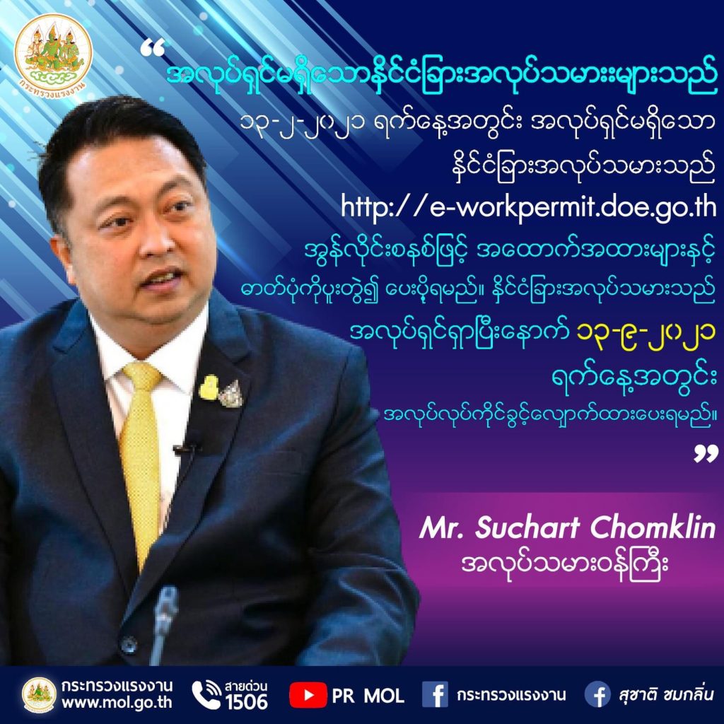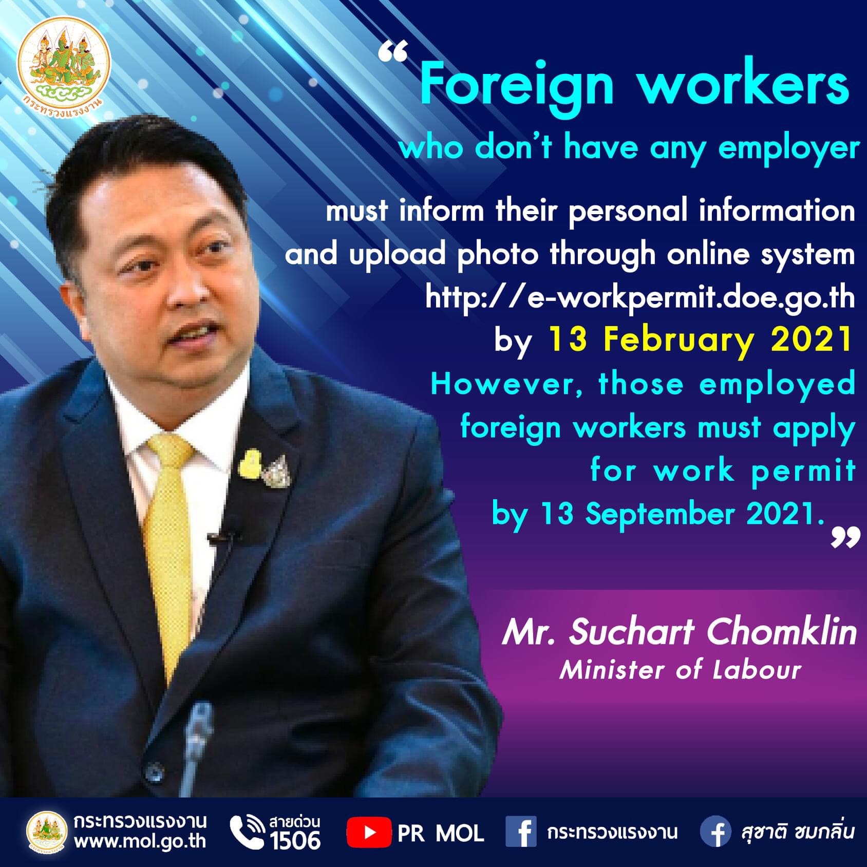 ทั้งนี้ “คนต่างด้าวที่ยังไม่มีนายจ้างจะต้องแจ้งข้อมูลตนเอง พร้อมแนบรูปถ่าย ผ่านระบบ http://e-workpermit.doe.go.th/ ภายในวันที่ 13 ก.พ. 64 และต้องมีนายจ้างพร้อมยื่นคำขออนุญาตทำงาน ภายใน 13 ก.ย. 64 นี้เท่านั้น”