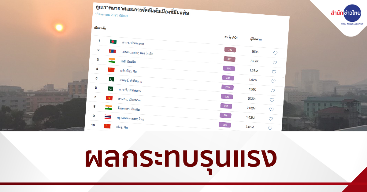 ขณะที่ กองจัดการคุณภาพอากาศและเสียง สำนักสิ่งแวดล้อม กรุงเทพมหานคร รายงานผลการตรวจวัดฝุ่นละอองขนาดไม่เกิน 2.5 ไมครอน (PM2.5) วันที่ 16 มกราคม 2564 เวลา 07.00 น. ค่าเฉลี่ย 24 ชั่วโมง พบว่าเกินค่ามาตรฐานจำนวน 70 พื้นที่ คุณภาพอากาศส่วนใหญ่อยู่ในระดับเริ่มมีผลกระทบต่อสุขภาพ และระดับมีผลต่อสุขภาพในบางพื้นที่ ค่า PM2.5 มีแนวโน้มเพิ่มขึ้น .- สำนักข่าวไทย